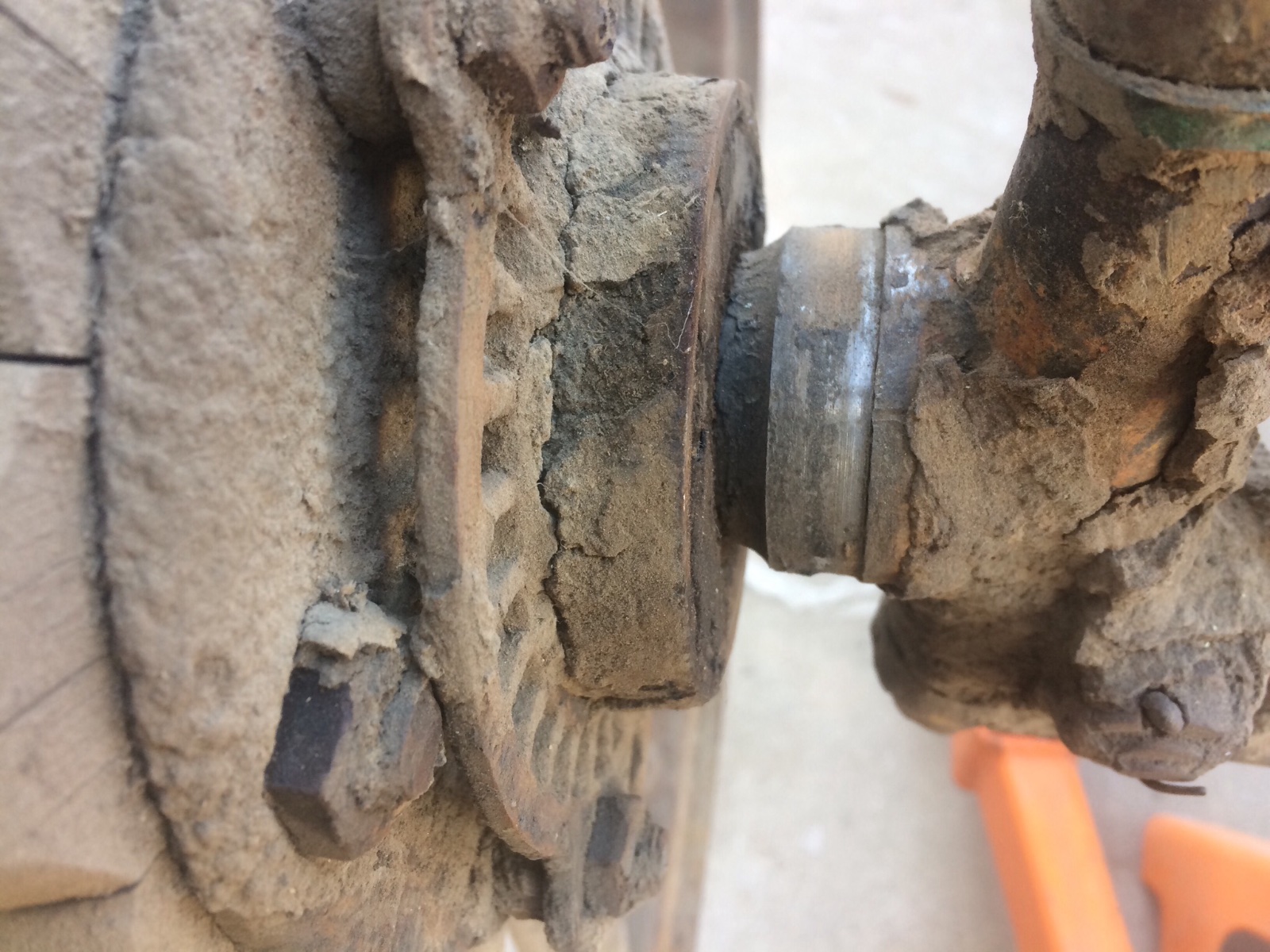 Heat source- angle grinder. Large monkey wrench was then able to move it... But that didn’t help in getting it off. But I found the flat spots that Steve mentioned. The other spindle did not have flat sides, so it must be an earlier one. I made a notch with the angle grinder. I am using this axle for rollers wheels, not a running car. The funny part was I found that my second old wheel had ball bearings. So I put one bearing race back on. I put light oil on it dirt cleaned off and it slid right on. So dirt must have caused it to bind up.