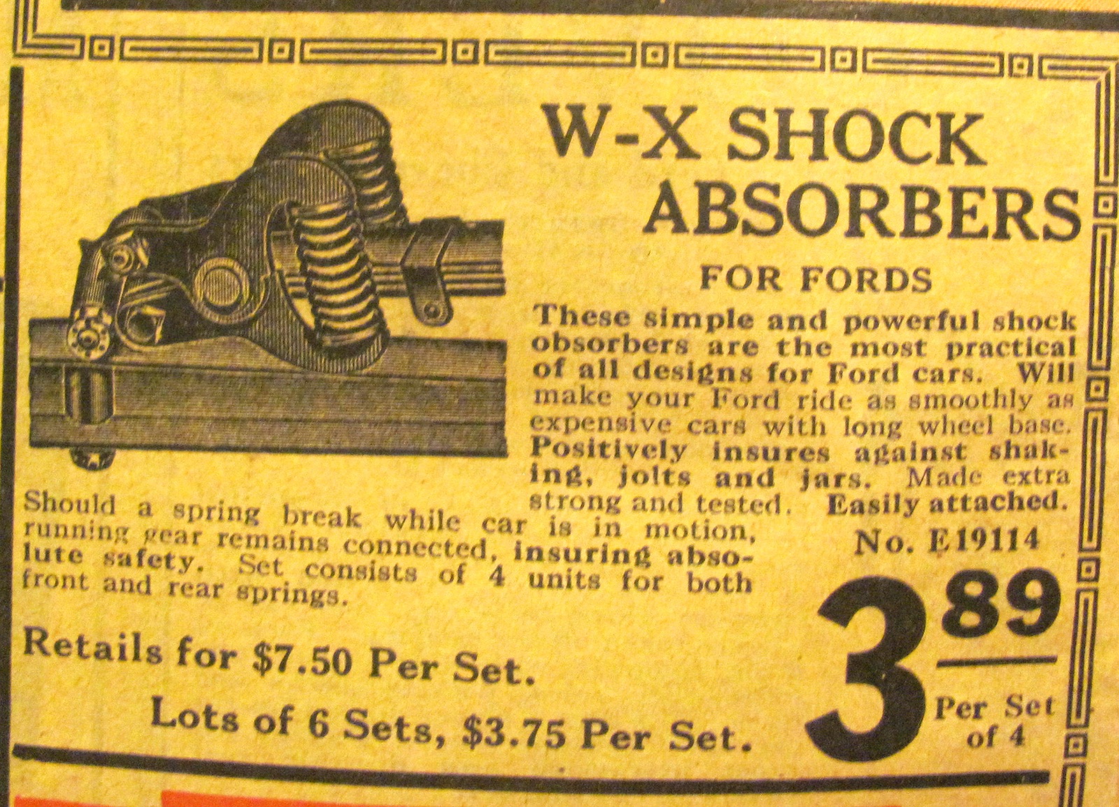 Believe those scissor action shocks are the W-X brand. On the market about 1915, but rarely seen on T's today, Hasslers being the preferred spring shock.