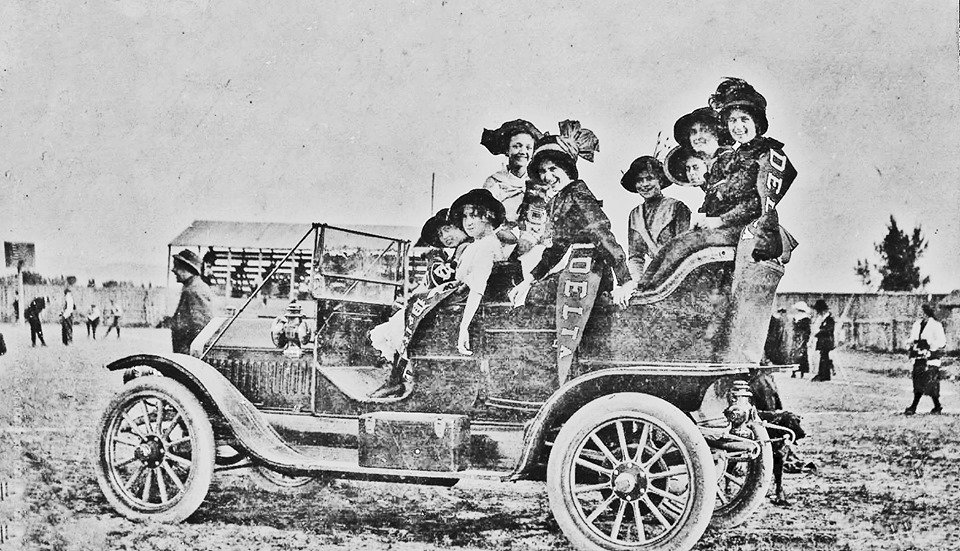 I have additional information about the photo that may be of interest. The nine young ladies in he vehicle are the first class of Delta Airline Stewardess on their way to their graduation ceremony. (see banners)