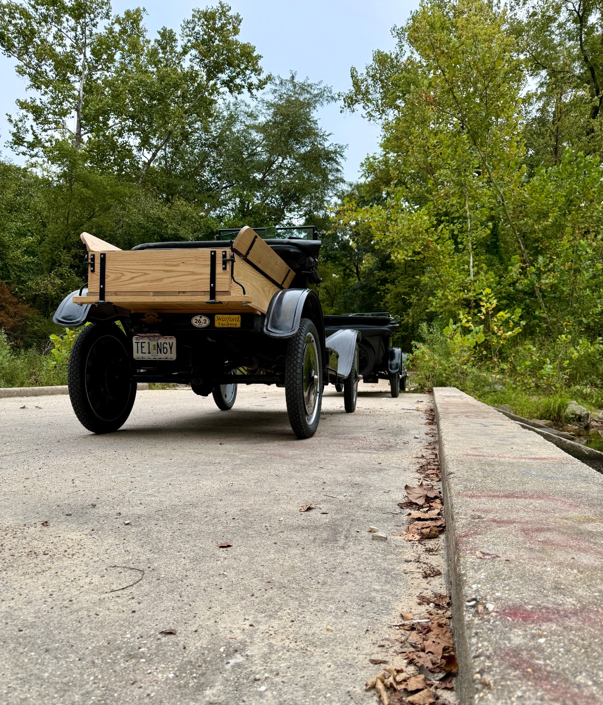 We went to Waynseville, MO passing thru several small towns, and great scenery. Our first stop was at Devil’s elbow on the Big Piney river while driving ove some Route 66 pavement. A well maintained thru truss bridge made for some nifty photos. Then of to the tourist hot spot known as Uranus, for a sideshow museum, fudge and ice cream. We hit the Neon park in Robertsville before heading to lunch in Waynseville. On the way back, John and I detoured off the planned route and found ourselves an adventure thru the Kaintuck Conservation area. Gravel, one lane road thru the woods along the stream made for some great Model T road driving.