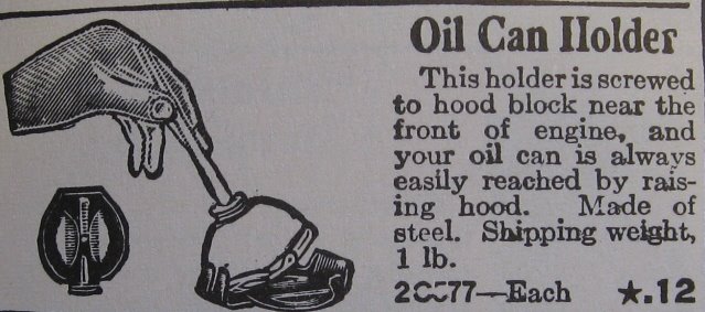 "Where's my ax?" I agree Tim. I have never seen anything on a Ford bracket. I guess they just rattled around in the trunk, tool box or under the seat. It seems they would tip over and loose lots of oil. We see lots of accessory brackets for sale that might not have been advertised if Ford had provided one.