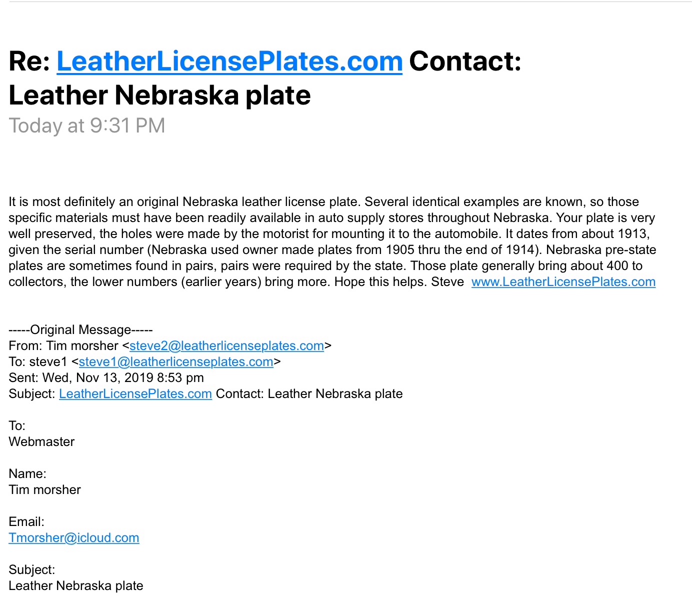 Now Erik, no dog in the hunt here. I’m not going to state anything you said was absurd. I am not a license plate collector, but if I were , I wouldn’t touch that one with a ten foot pole. If I lived in Nebraska and wanted to display it on a 1914 auto, for a reasonable price, I’d be all over it. Do you know anyone that actually uses a fragile, ORIGINAL leather plate on their auto?