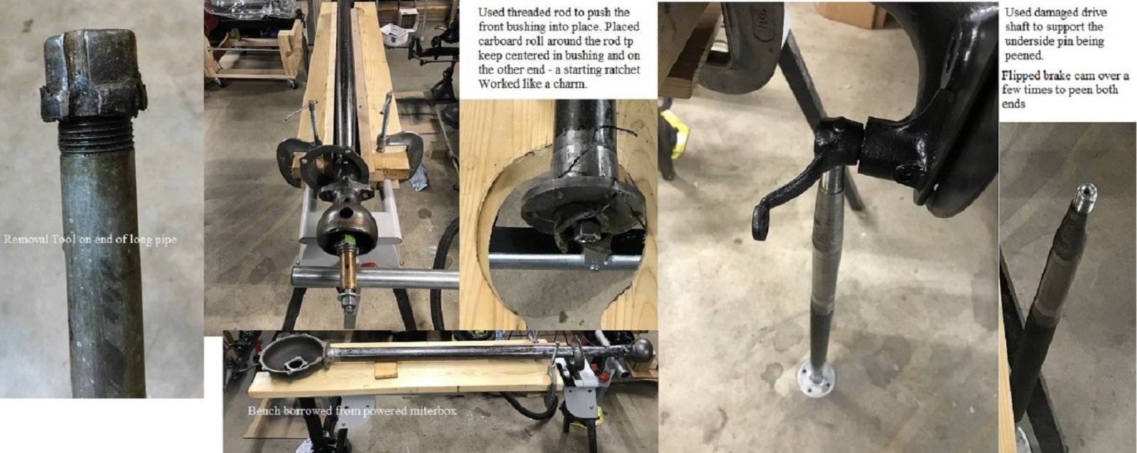 Setup an old axle for peening. Threaded rod for pressing in the bushing - wrapped some cardboard around the rod o keep it centered in the new busing and used an old one to to clear ball cap end. Only intending o do just one.