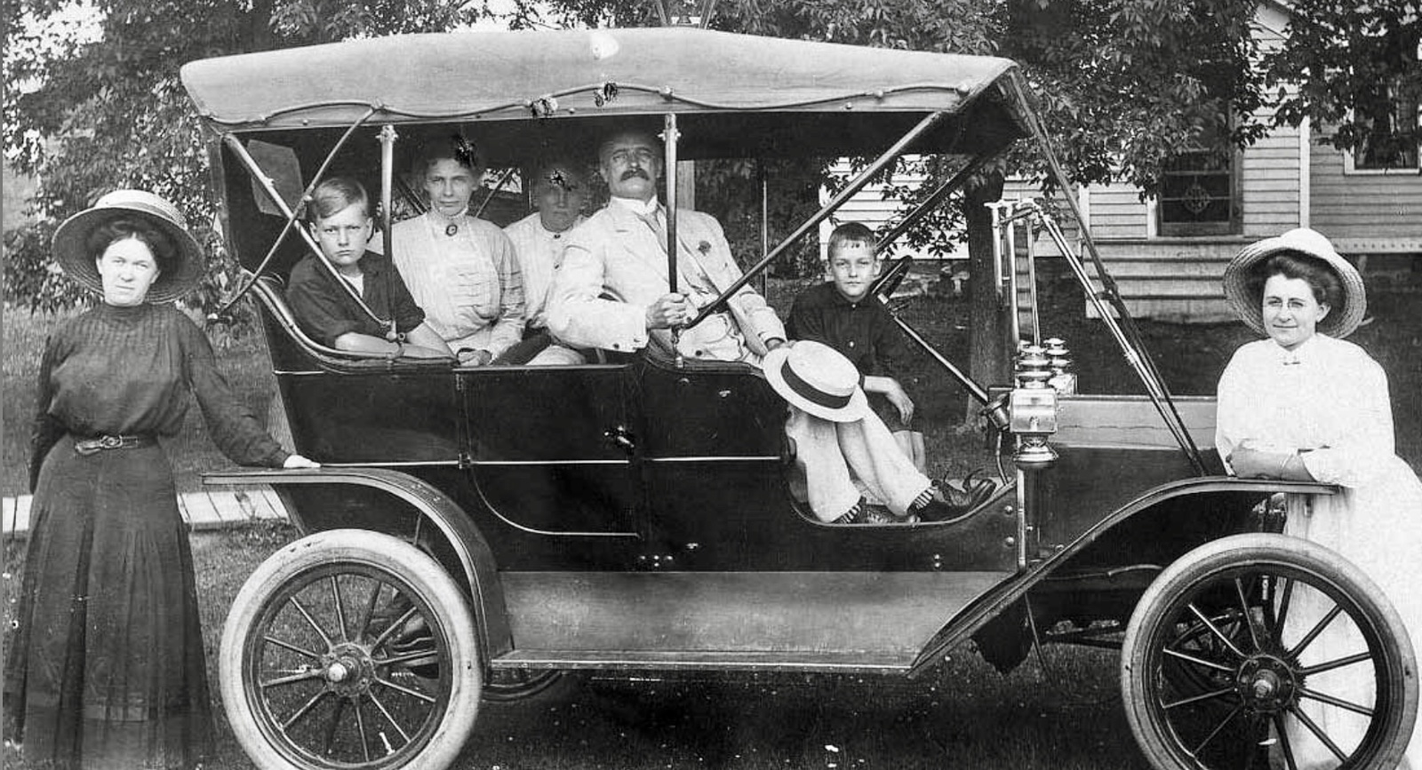 Numbers one and two? Same people, same car. I cannot see the hand brake lever, it must be behind the boy's leg, and therefore pulled fully back. Because of the position of the boy's leg, and the fact that a second (reverse lever) cannot be seen in its more natural straight up position, it is likely that this is not a two lever car. Zoomed in, I can only see two pedals, however, their position makes it appear to be the brake and reverse pedal. Only the very top of the reverse pedal can be seen rising above from behind the man's shoe. I would speculate the low/clutch pedal to be lined up behind the brake pedal. Nails along the edge of the running board indicate it is early enough to have the wood/linoleum/metal trimmed running boards, which make it a real 1909. Square fronted front fenders and rear fender butterfly brackets being inside the fender would narrow down just when in 1909 the car was built, however, I am not quite sharp enough to know offhand just when that would be. The door handle being low on the rear door would also help. Notice also the two bolt front body bracket.