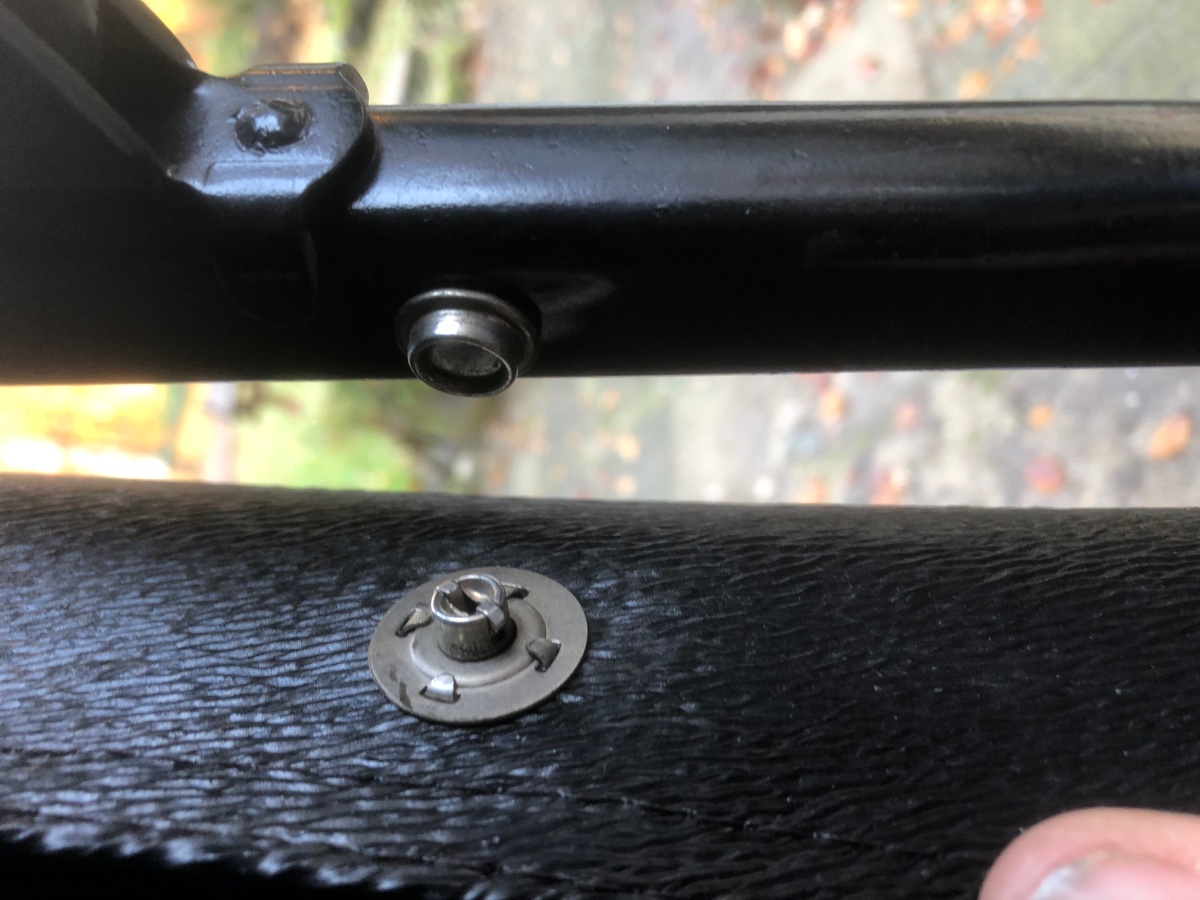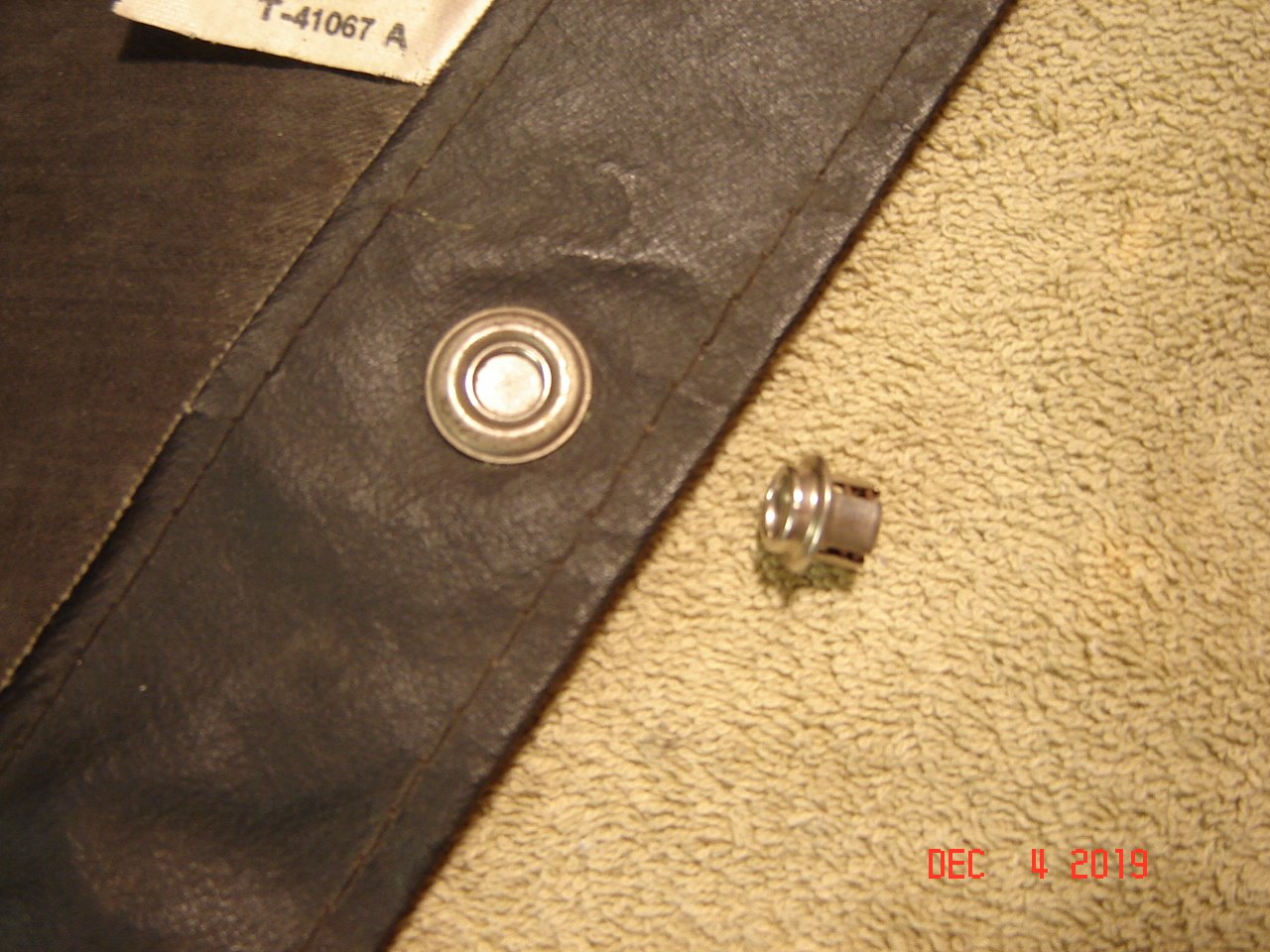 Even though this NOS side curtain is labeled for 1925, I think that it is actually for 1926-27 roadsters. The "sockets" that are installed inside the rear top bows on 1926-27 roadsters and tourings must have the extra lip to project through the grommets on the rear side curtains. ( I think Larry Smith identifies these as ANZO fasteners.) A similar "socket" without the lip is used on the body panel between the doors on 1926-27 tourings and also on the doors of most 1927 roadsters and tourings. If you use the socket without the lip on the inside of the rear top bow, the fasteners that are crimped onto the rear curtain will not snap into the socket when the side curtains are installed. That lip is to allow for the thickness of the grommets in the side curtains when it is "sandwiched" between the top bow and the rear curtain where it wraps around the back and fastens to the top bow. I think this type fastener is only used on the 1926-27 Model T's, but maybe it was used on Model A's, too. I don't know. See the photos of the sockets an how the grommet fits snug on that lip. The grommets have to be installed quite accurately in the side curtains to match the sockets.
