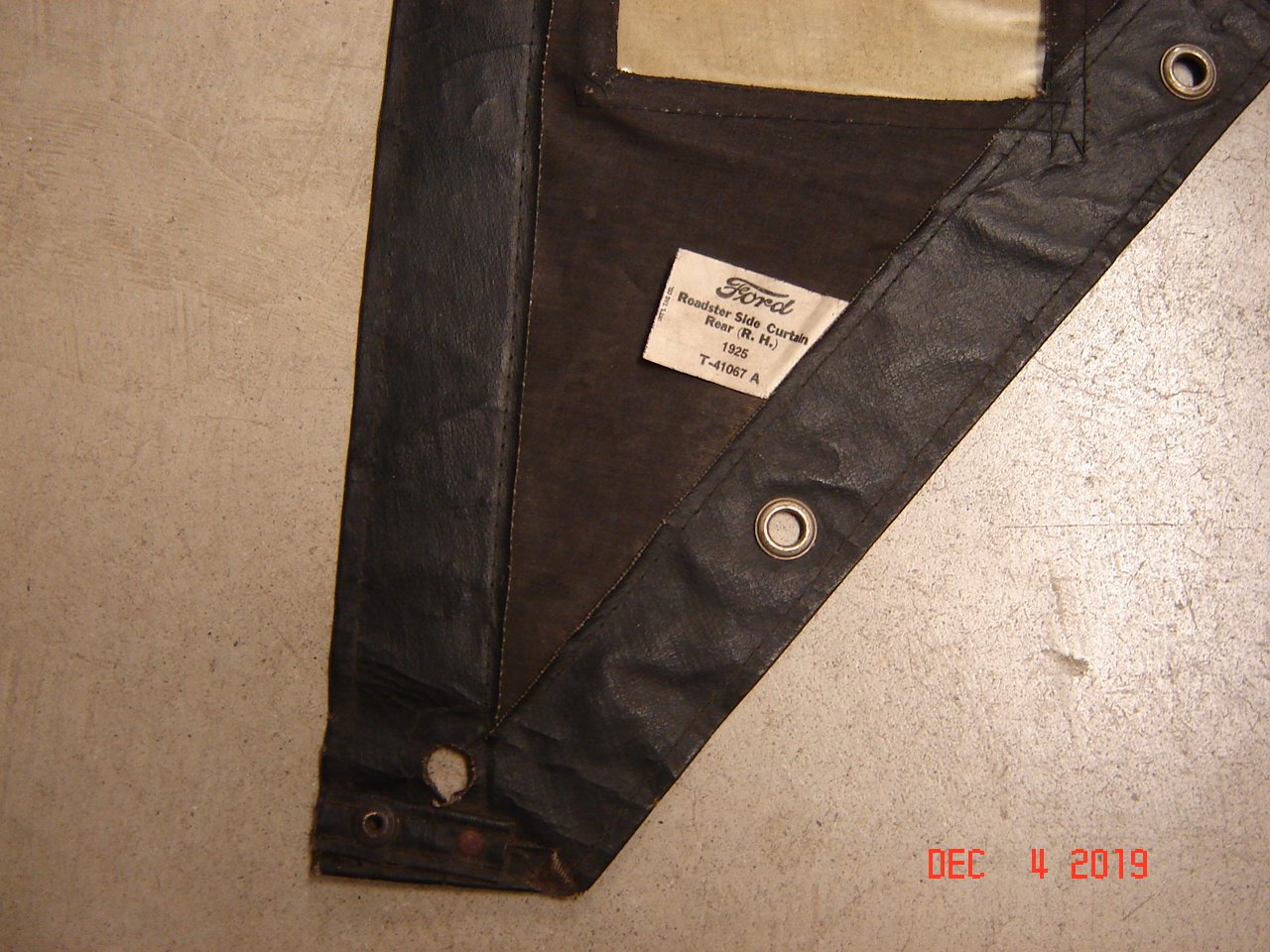 The attached pdf file contains sketch/ with dimensions, of the curtains for the '26-'27 runabout made from original pieces. See the note that no flap on passenger side. And see photo of original curtain on passenger side, no flap, but as the curtains fit loose at the door , and there are no snaps on the lower edge of the curtain, easy to lift the lower curtain edge and grasp the door latch!