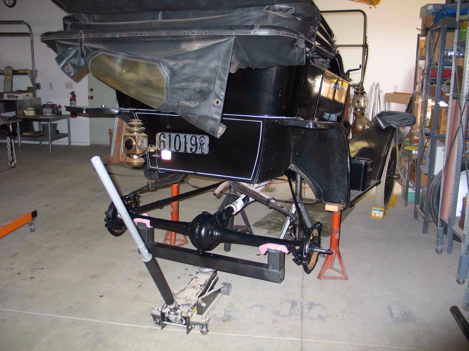 When I removed the rear axle in Betsy to install her Ruckstell, I made a cross bar that spanned the rear frame rails and supported the car with it. If you decide to make a cross bar, make it beefier than mine, mine worked OK but was a bit saggy.