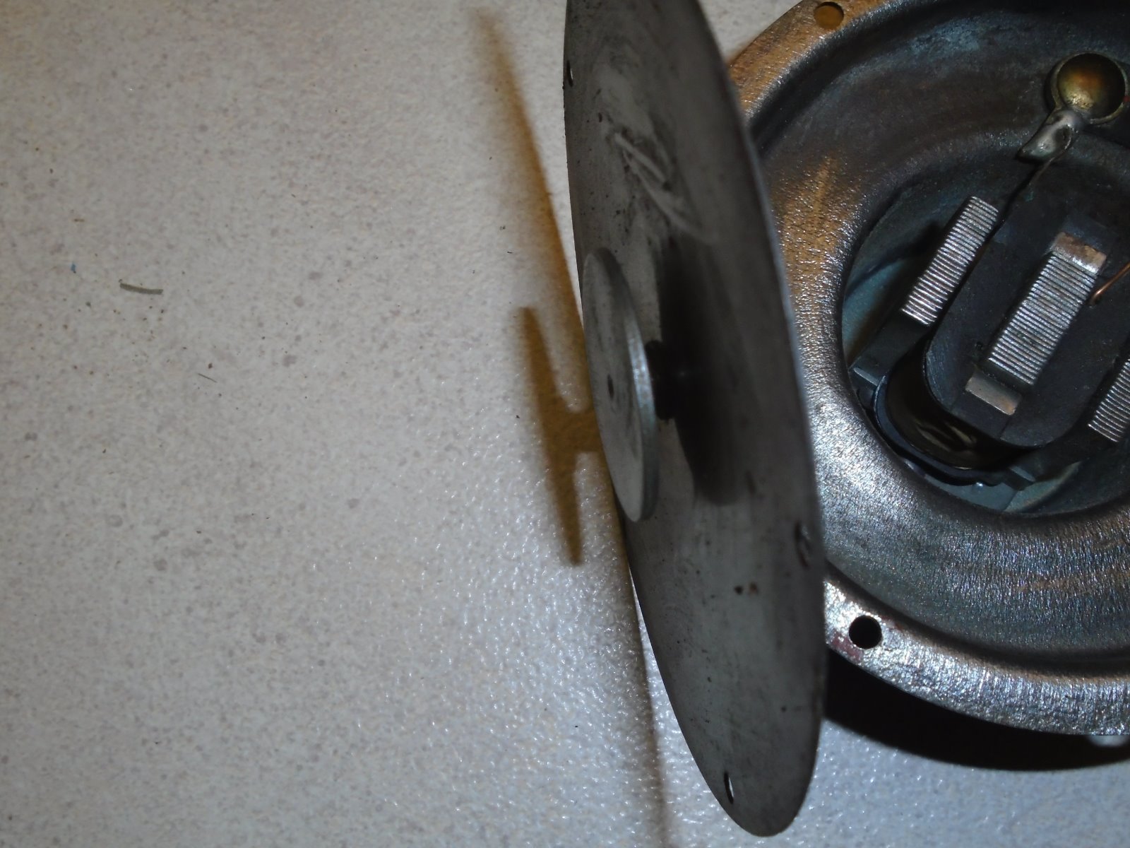 I know that is going to sound like a real strange request...but does anybody have a close up pictures of the diaphragm for a magneto horn? What I want to see is that center post, nut, washer and what-cha-ma-call-it pedestal looking thing in the center (beater?)...looks like close up or if you can tell how it is assembled (that part only), that would work too. I know the screw with the nut on it, is for adjusting the noise, except I'm wondering how does it make that noise with those parts. I'm assuming that the big pedestal looking thing that goes on the inside towards the coil hat, is what is making the noise and the diaphragm is just a resonator, which is amplified by the bell in a megaphone effect. But does it wobble in and out against the diaphragm on that bolt with the jam nut? I know as those coils energize and de-energize it attracts and repels that slug back and forth, what I'm trying to figure out is, if that action causes it to rattle on the diaphragm and adjusting that screw in or out either increases or decreases the (albeit slight) travel of that piece.