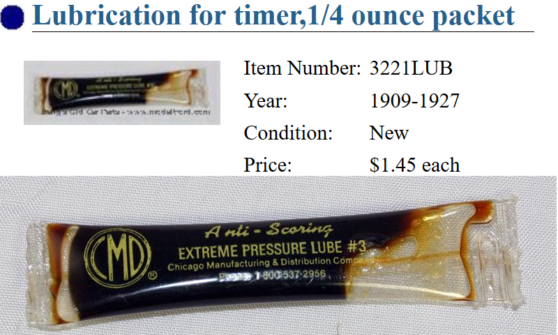 I have read what Ford recommended back in the day, but in the 100 years since then, we have made big advances in lubricants, as well as the personal experiences of our MTFCA members in what they have discovered works best on the roller type timer. What lubricant do I use on the roller type timer and how often should it be lubricated? Valvoline red bearing grease? White Lithium Grease? 30wt Motor Oil? 3 in 1 oil? Gun Oil? Etc. Thank you. Jim Patrick