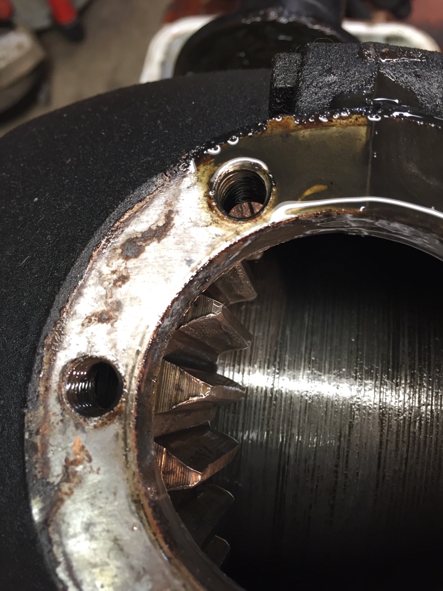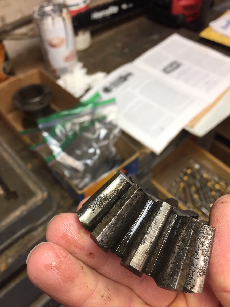 Here are photos of my ring (40 tooth) and pinion gear (11 tooth). I do not have a better photo of the ring gear as we haven’t split the axle halves yet. No chips, fractures, or missing teeth. But as you can see, lots of pitting on both. The ring gear has some wear and burrs along the top edge.