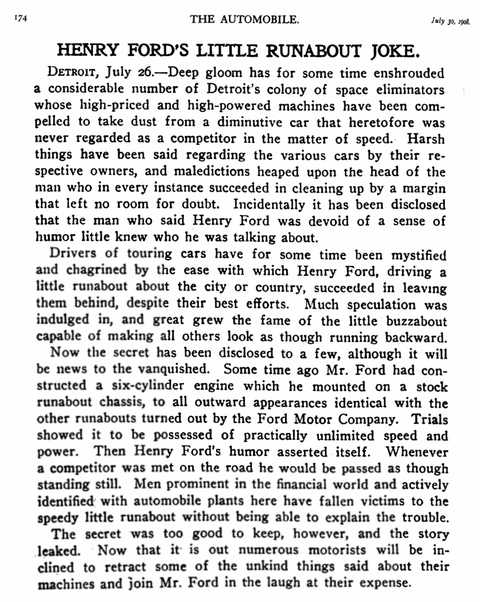 In this case, there’s more. During the summer of 1908, Henry Ford is seen driving a runabout that is overtaking more powerful cars in the Detroit area. First, an article in the July 30 1908 issue of “The Automobile” titled “Henry Ford’s Little Runabout Joke:”