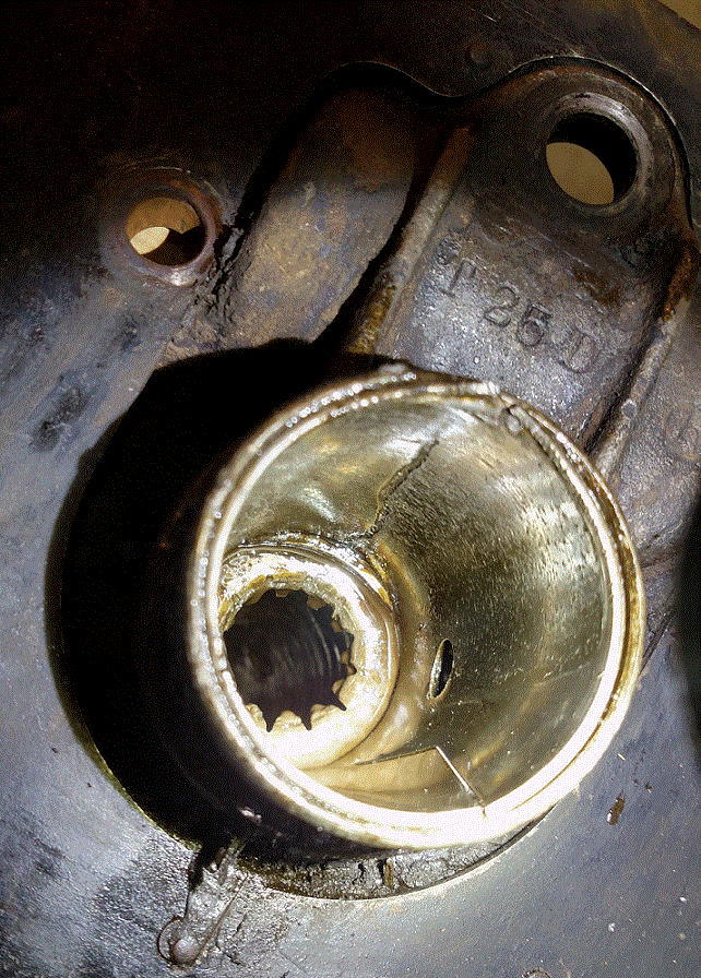 I'm disassembling two rear ends to make a good one for my car. It looks like this bearing sleeve is probably original. The upper surface is worn through and the "V" split is closed. My sleeve removal tool was not useful in this case. It took a hammer, chisel and vice grips to get this out.