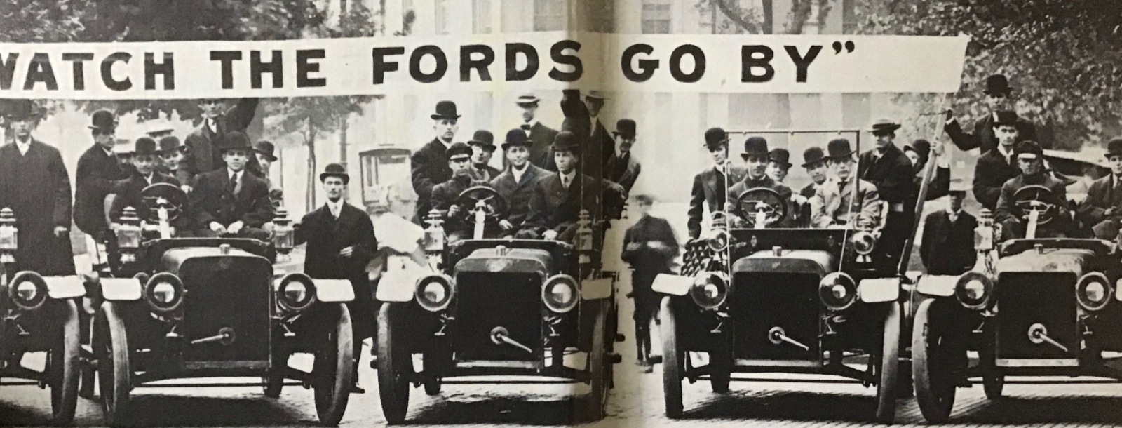 This rather famous photo of that Ford marketing tag line is from 1907, and the Fords are the big 6-cylinder beasts