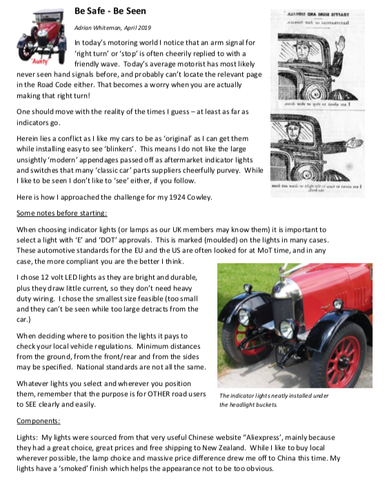 I tried using period glass lens taillights for turn signals with poor results. These lights were intended for use at night, and typically either are hard to see, or cannot be seen at all in daylight. What works for me are the simple round taillights that are sold for trailers. Replace the 12 volt bulbs with 6 volt bulbs and they can be seen much easier by traffic behind you than the period style lights. In addition, I make a mounting bracket to mount them below the body on either side. You can still use the period style stop/taillights if you want, but now you have brake lights and turn signals that can be seen by the drivers behind you.
