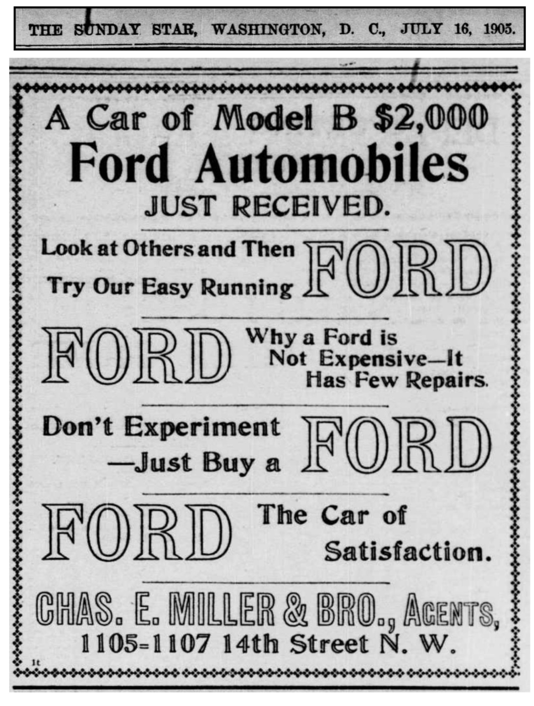 Charles E. Miller & Bros. was an early Ford dealer in Washington D.C.. In the advertising below we see two Ford Model B had just arrived at the dealership. We know this because the ad reads “a car of Model B,” or a train car which held 2 Model B. The newspaper is dated July 16, 1905, and reports the “B” were “just arrived.”