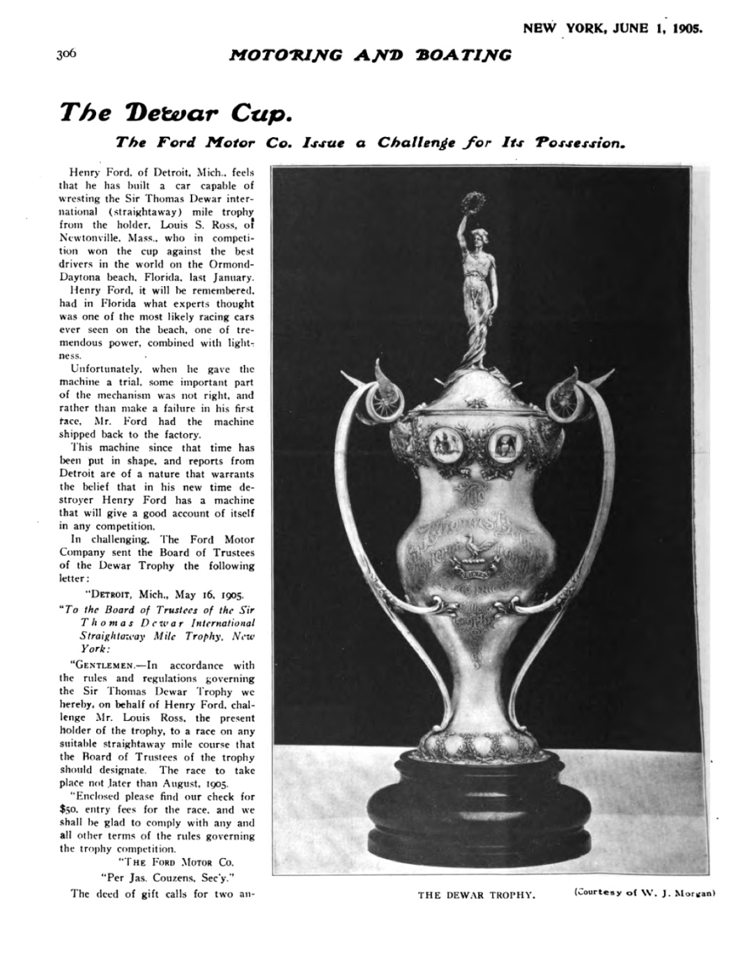 Henry Ford challenged Ross for the Dewar Cup as stipulated by the rules, and Walter Christie, inventor and driver of the Christie Special soon joined the challenge in the spring of 1905. Ford had hoped to challenge for the trophy as well as world mile record at the Ormond (Daytona) Beach Races in early 1905, but a broken crankshaft prevented him from participating in the races with his new six cylinder racer.