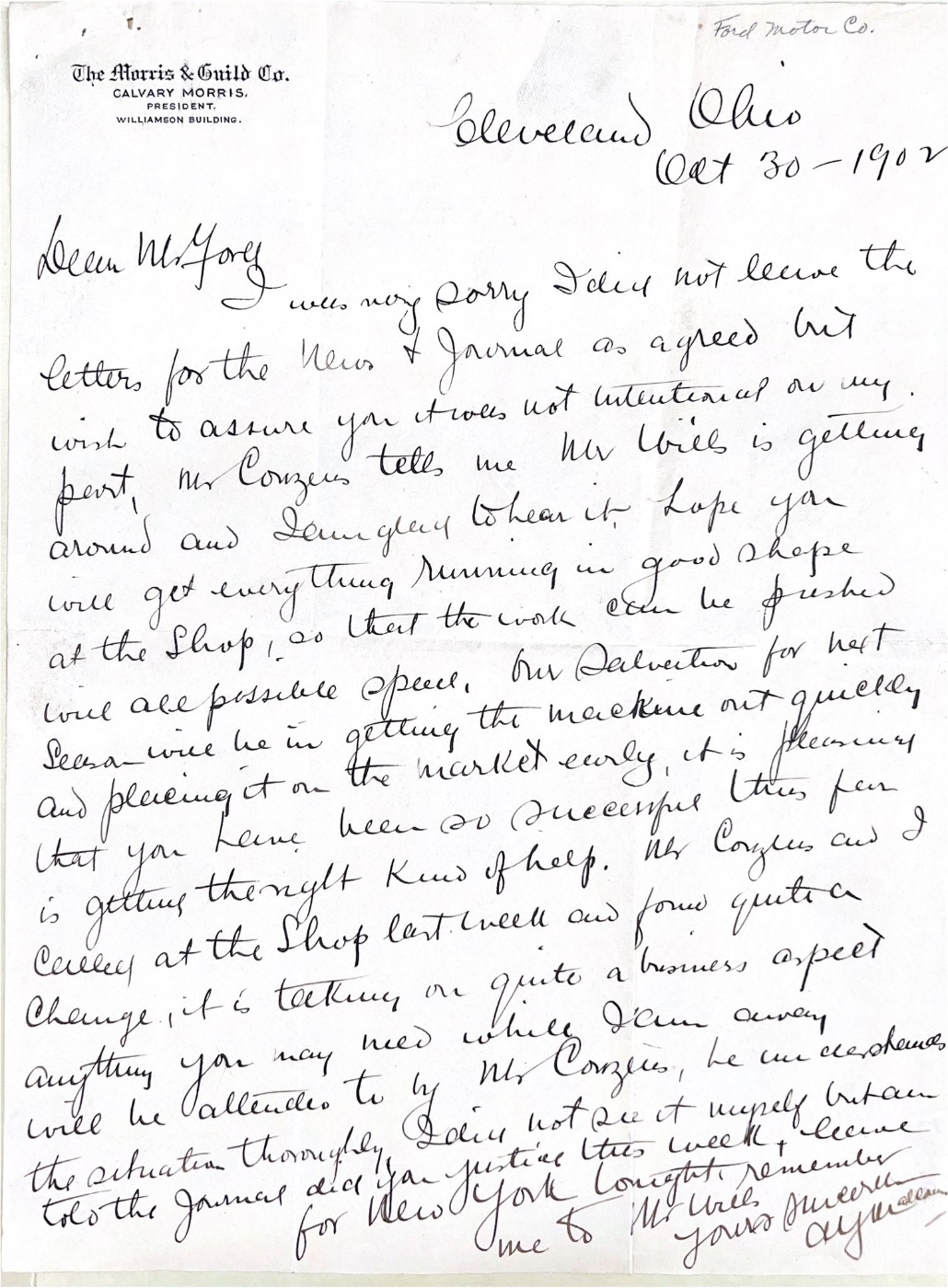 October 30, 1902 letter, A.Y. Malcomson to business partner Henry Ford.