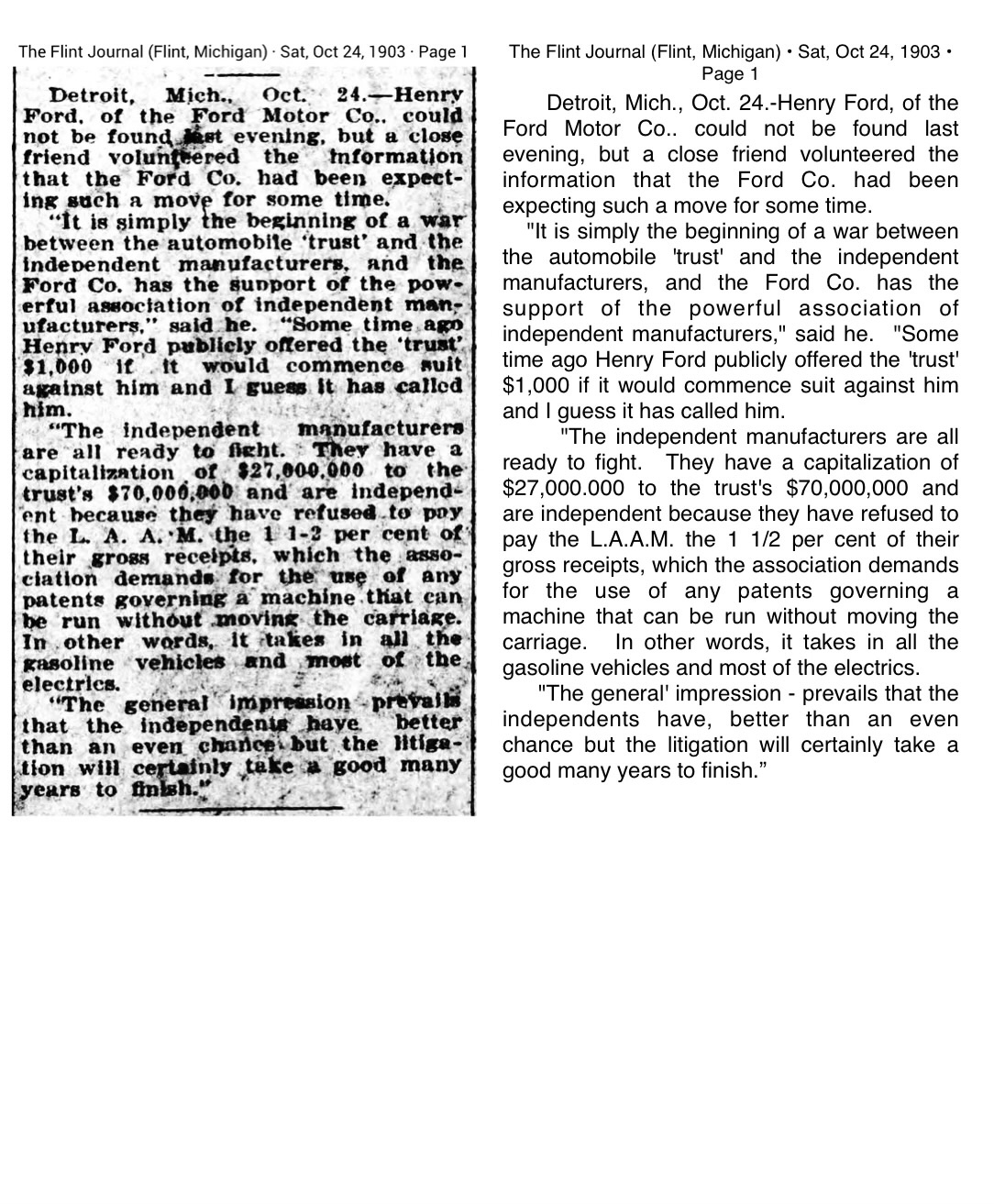 Ford Motor Co. began selling cars in July 1903. The company experienced immediate success, and sold almost 200 cars by the start of their first full fiscal year, beginning October 1, 1903. The Electric Vehicle Co. wasted little time initiating a law suit. This author indicates the suit is expected to last for years. He was right.