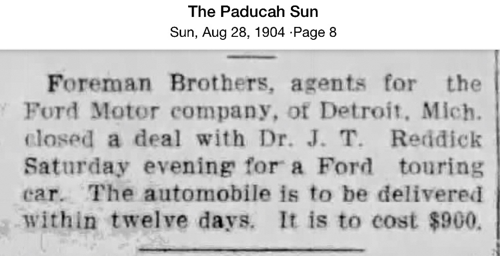 Next, the local newspaper confirms the Ford Model A arrived by September 15, 1904. The railroad moved the Ford Model A from Detroit to Paducah Kentucky in two weeks.