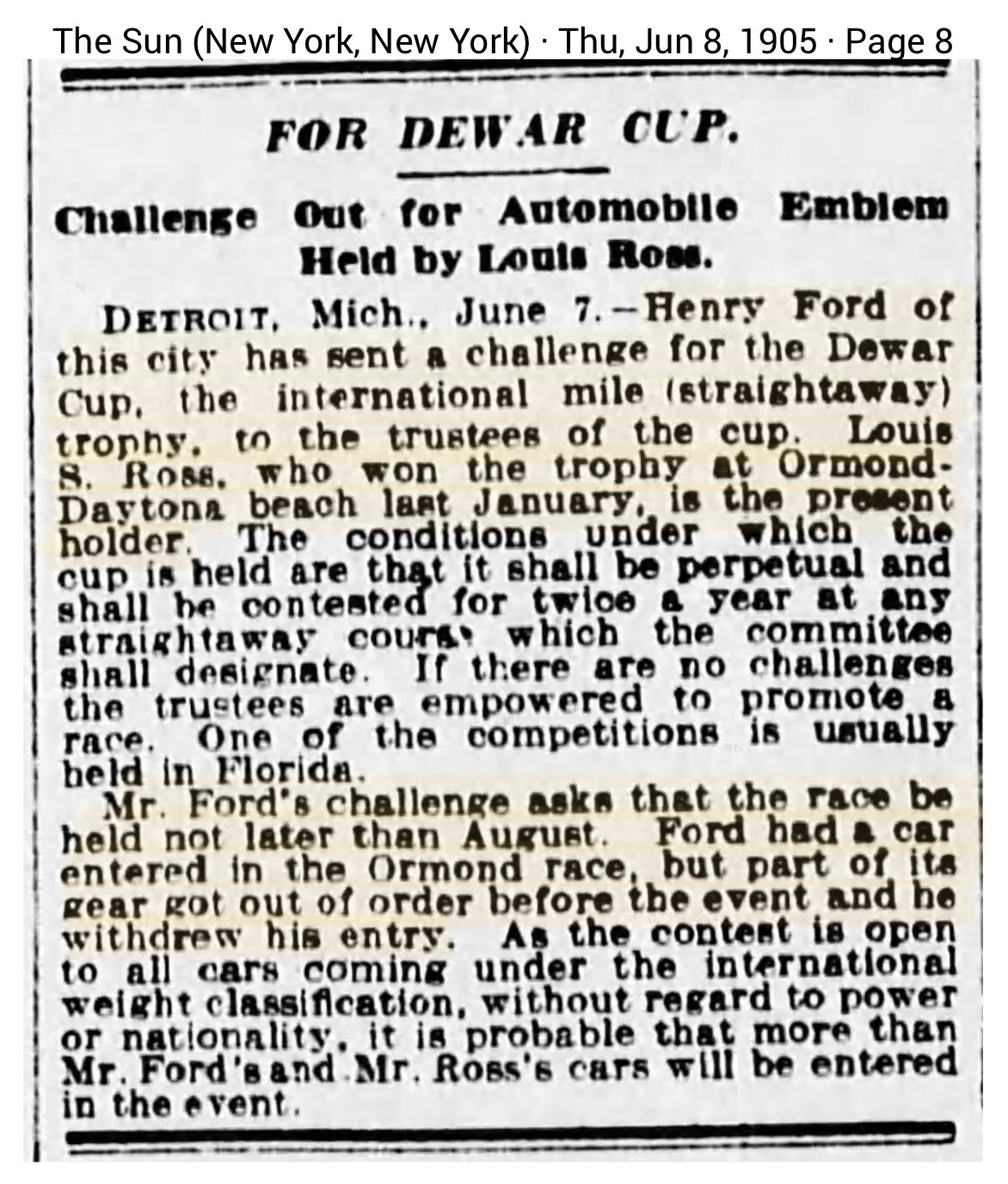 Henry Ford challenged Ross for the Dewar Cup as stipulated by the rules, and Walter Christie, inventor and driver of the Christie Special soon joined the challenge in the spring of 1905. Ford had hoped to challenge for the trophy as well as world mile record at the Ormond (Daytona) Beach Races in early 1905, but a broken crankshaft prevented him from participating in the races with his new six cylinder racer.