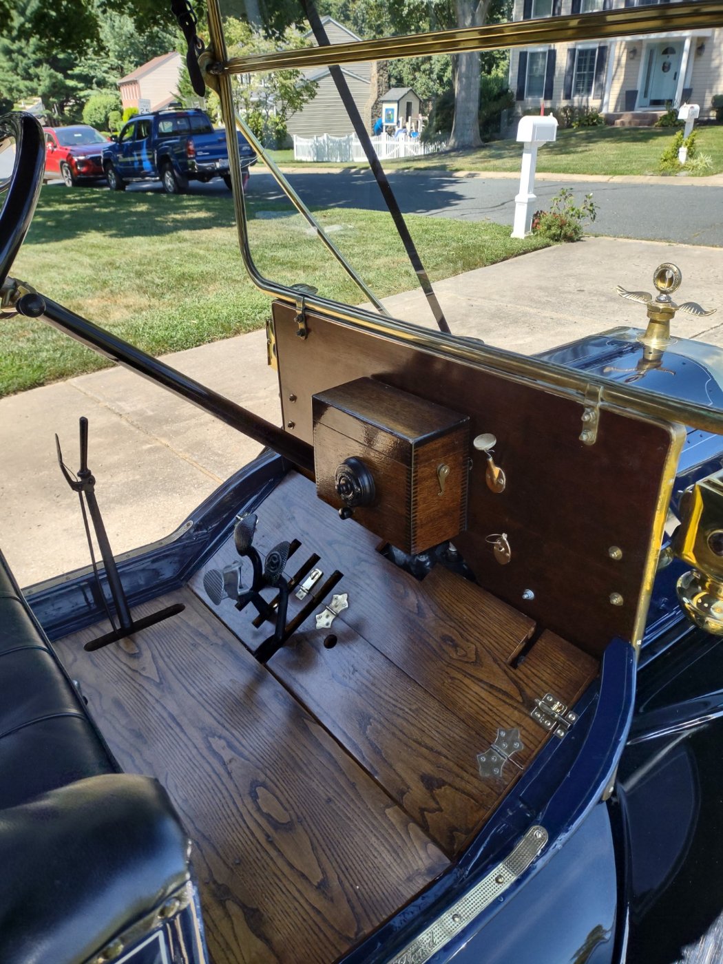 1912 Touring with slab side. Ground up restoration completed June 4, 2016. On the maiden voyage a rod went through the 1912 block 3 miles from home(previous owner restored engine but never ran it.) I kept the block and purchased another engine around 1923 I think, from Kevin Pruss. I have the receipt that tells about the rebuilt engine. The front doors were never put on the car. I have new inside panels if you want to put them on. I alsio have the door handle for the passenger side. The bungy cord on the passenger door is to stop the rattle. Over time the body relaxed and the door to body space increased. Has Rocky Mnt brakes. Has aluminum crank. Lights are not set up to work. Paint is very good with areas of minor scratch or chip. Needs new tires and has a cracked front windshield from tights screws when I pulled the top windshield down. Has leather seats. Pictures speak for themselves. Runs very well comfortably at 30-33 mph; although the phone app records that is goes faster, but I do not recommend faster. It had a tune up last week by a model T mechanic. Large mirror not included. Sandwich sign panels are included but not the sandwich sign. Won a trophy at every car show entered. Located about 45 minutes north of Baltimore. Might possibly be at a car show September 9th Seaside Heights NJ. $24,500