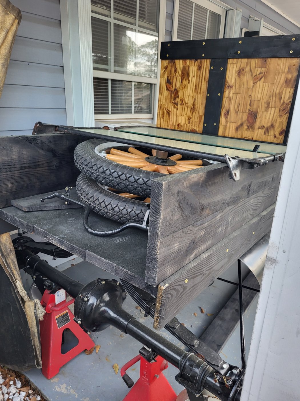 Includes motor, transmission, radiator, axles, frame, gas tank, windshield, 4 restored wood spoke wheels, axle & steering column restored.