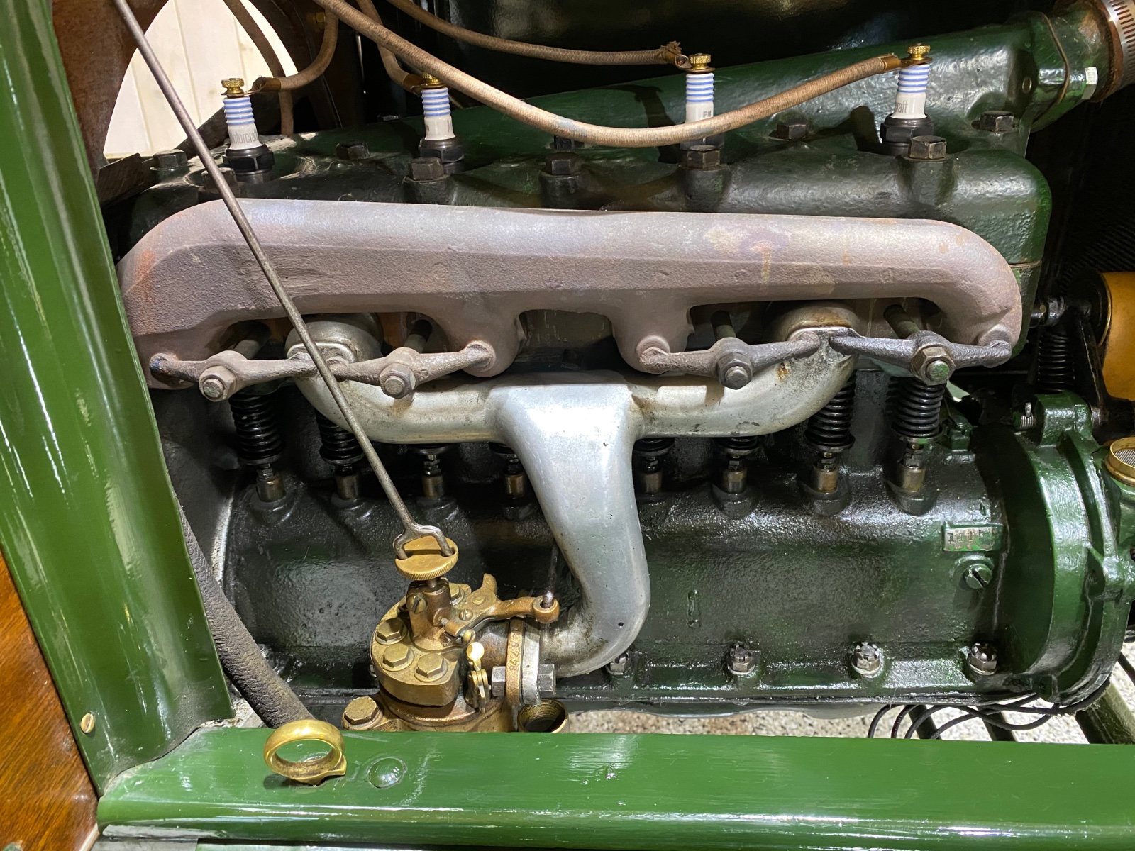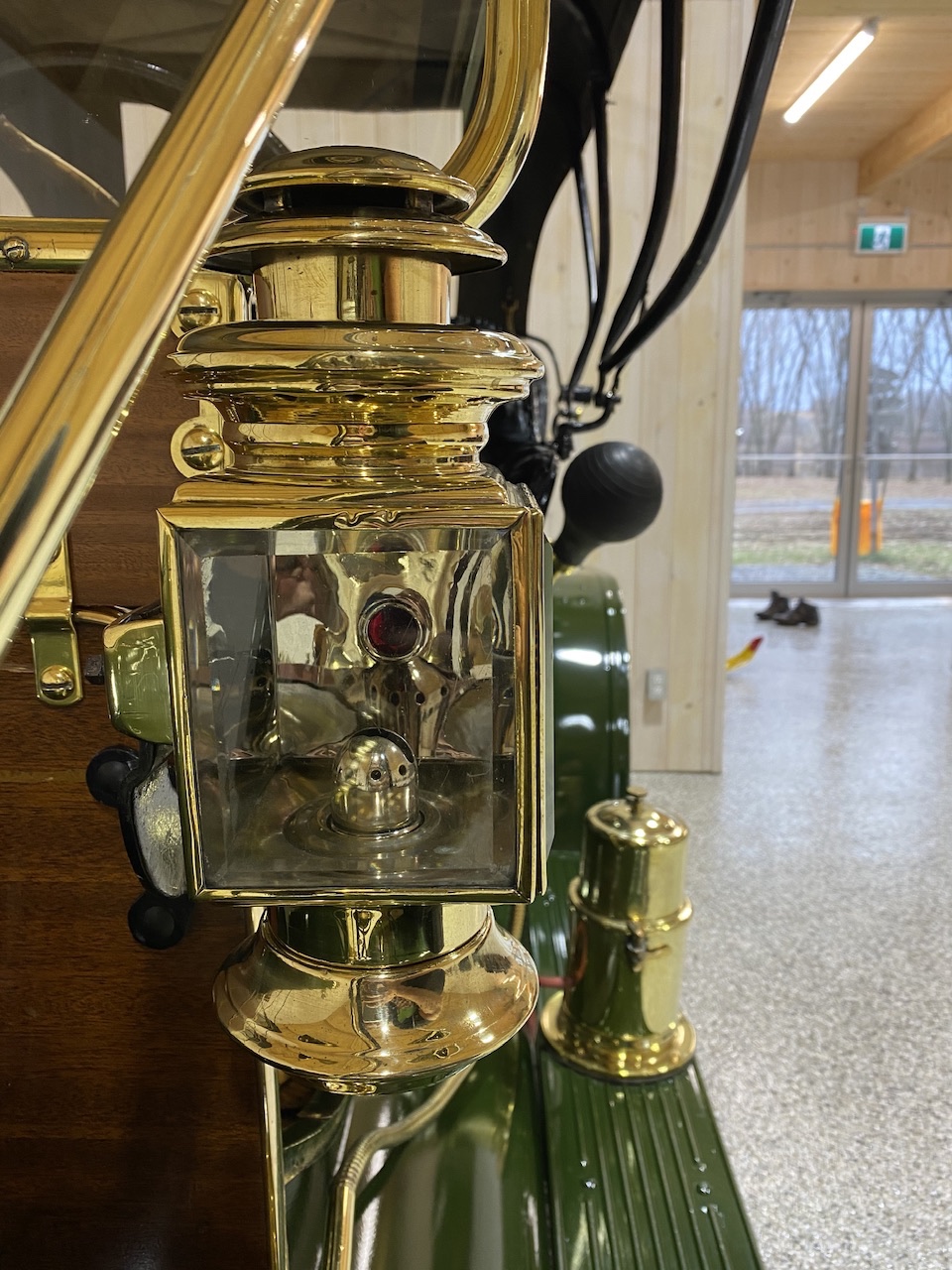 The head lamps are original Jns Brown Model 15’s and are connected to the gas generator with correct tubing. The side lamps and the tail lamps are beautifully restored Jns Brown Model 60’s. I agree the tail lamp should be marked Model 75 but I gather for a few months they were marked Model 60, same as the front. Mine has the correct “error”.