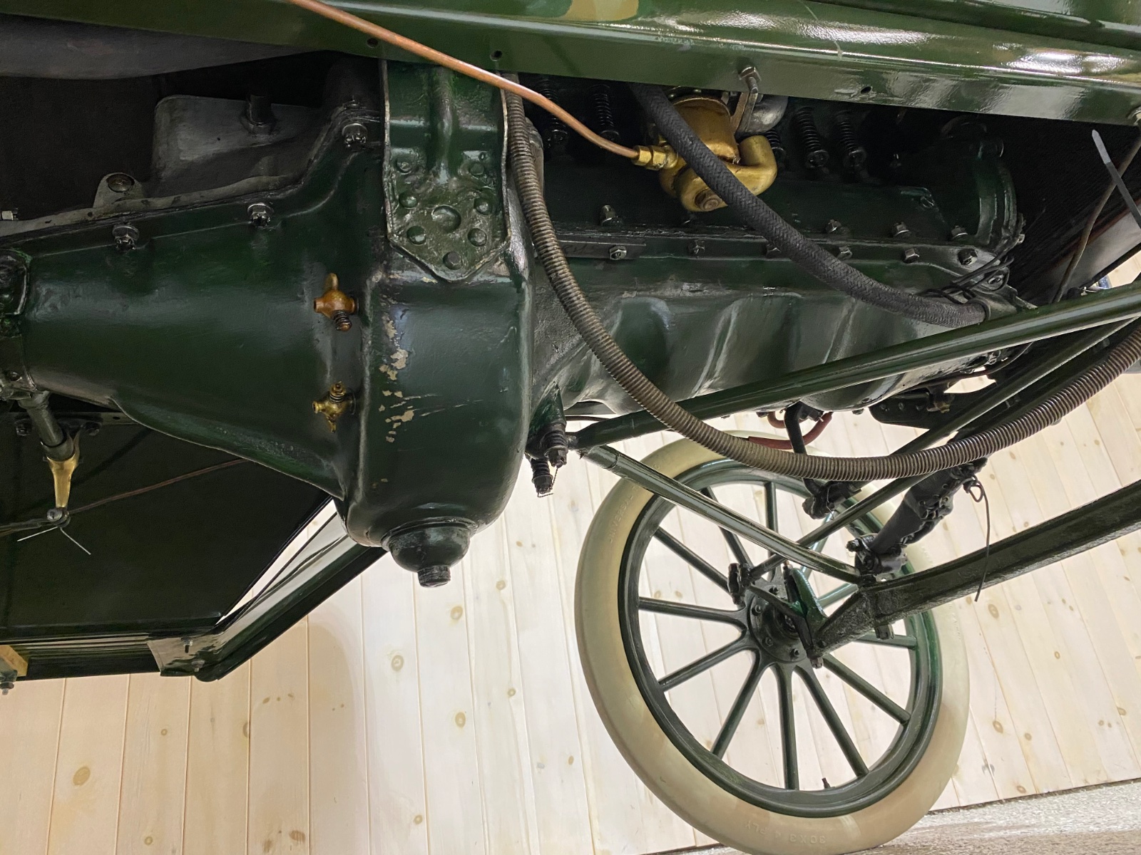 The wheels were rebuilt by Stuzman and include custom hubs that externally look identical to those shown in the Encyclopedia but internally use the tapered axles. Similarly the rear axle looks correct for the year but internally has Hyatt bearings at each end of the axle shaft. The wheels are currently equipped with white tires and the car has a spare set of new tires included. The steering column is 50” long and is equipped with a brand new brass quadrant.