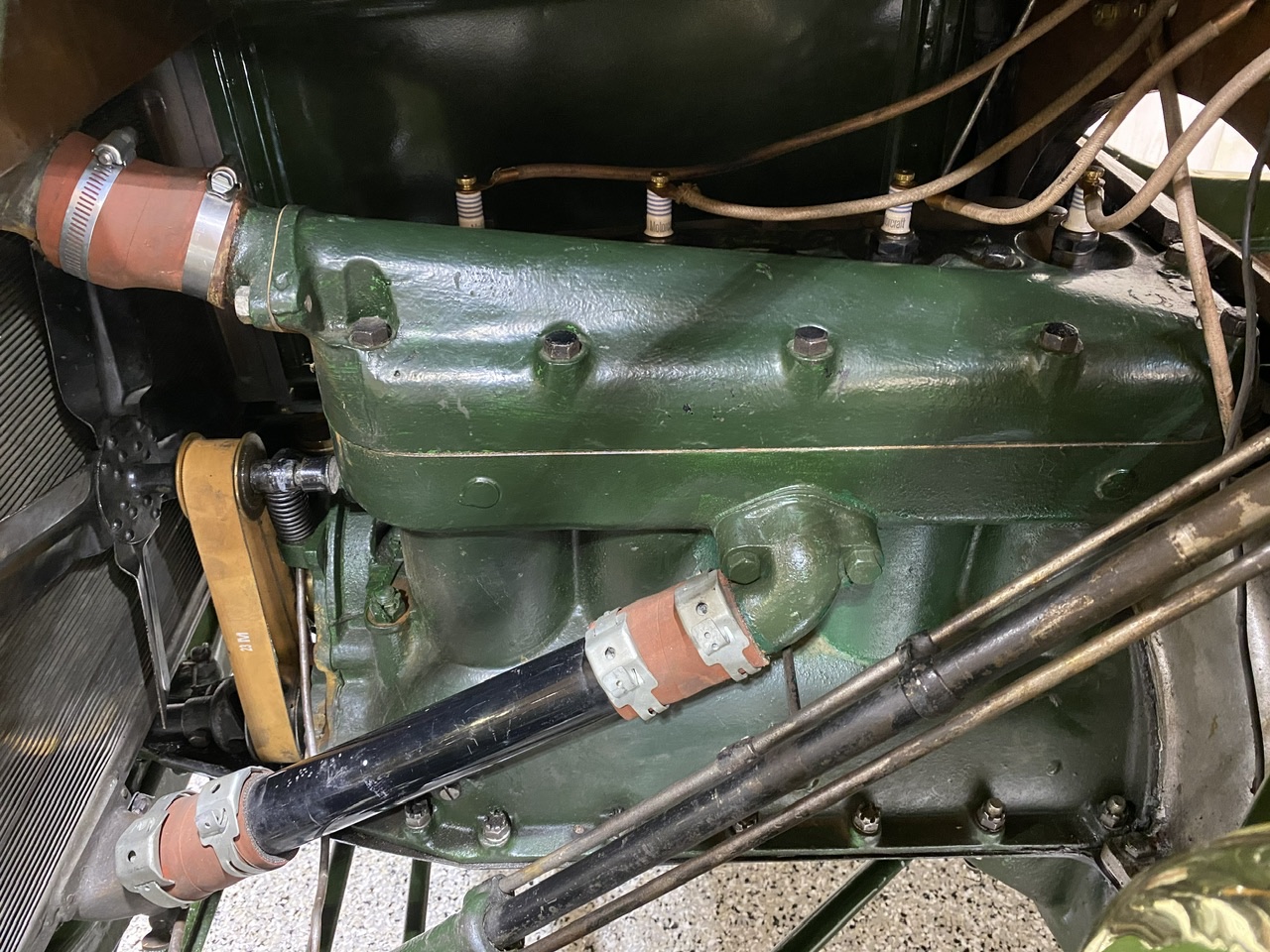 It has around 500 miles on the engine, following a comprehensive rebuild which included all new babbitt, new piston, valves and a new SCAT crankshaft. The block is original and even has an obscure boss on the left side which was apparently intend to provide crankcase ventilation. The coil box is a correct Kingston and includes four rebuilt coils. The commutator is a reproduction “two piece” timer. The sway back inlet manifold includes the correct Kingston five ball carburetor. The car have a Holley NH carburator too. The transmission has new bands but included all the original cast and machined parts that were used in these early builds. Of course it has the square hogs head mounting the three pedals and the one piece pan. The transmission shaft is dated with the date is was assembled “9 30 09” in this case. It have the proper rear end and the one piece spindle.