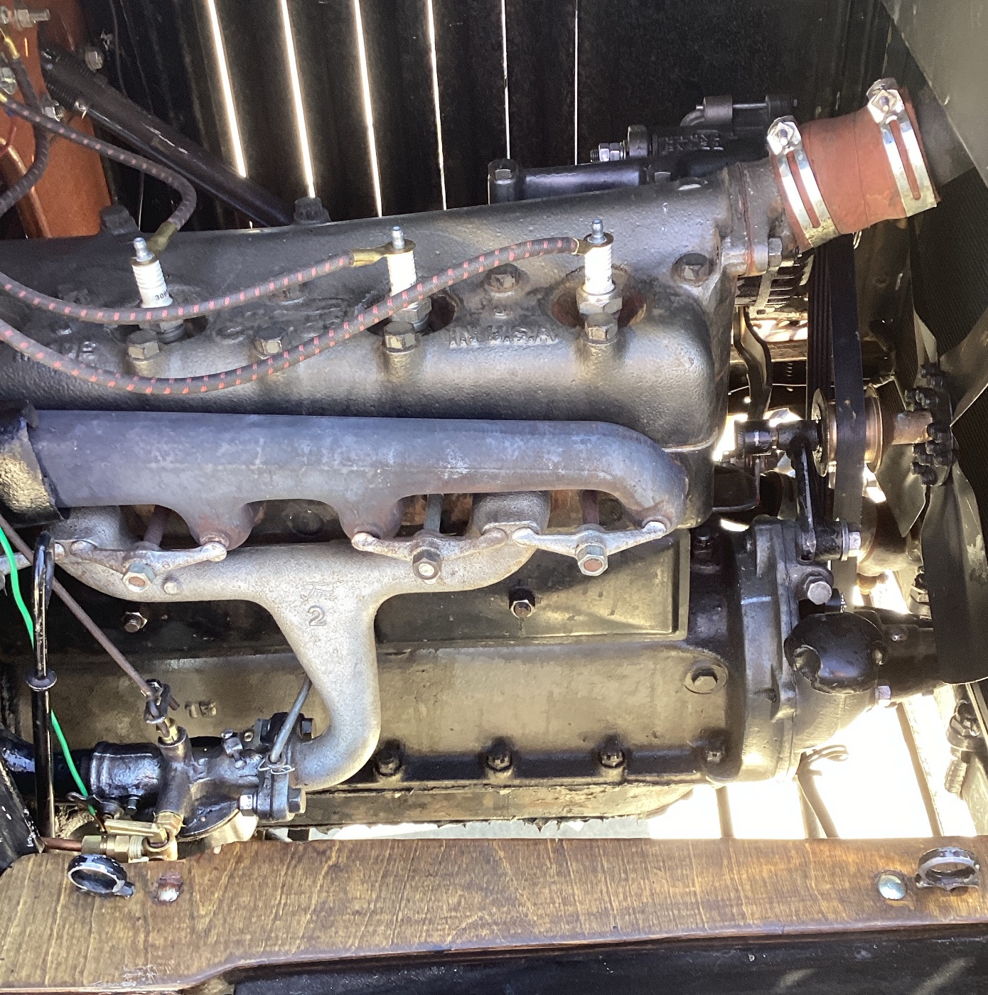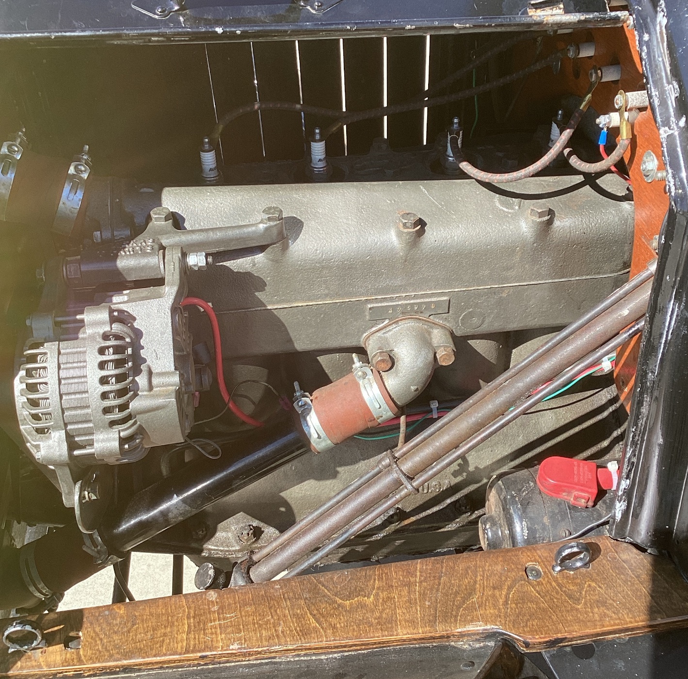 New aluminum pistons, new valves and seats, 280 cam, new Babbitt, re ground crank, new intake and exhaust manifolds, new ring gear for the starter, rubber seals on the pedal cams, resurfaced head and the block, outside oil line to the front of the motor.