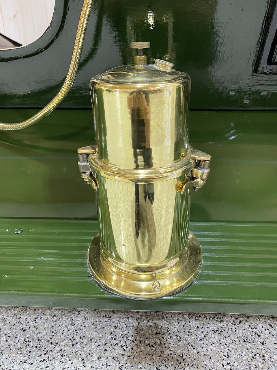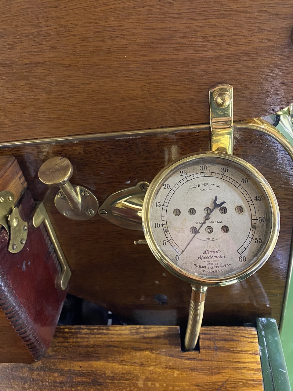 The head lamps are original Jns Brown Model 15’s and are connected to the gas generator with correct tubing. The side lamps and the tail lamps are beautifully restored Jns Brown Model 60’s. I agree the tail lamp should be marked Model 75 but I gather for a few months they were marked Model 60, same as the front. Mine has the correct “error”.