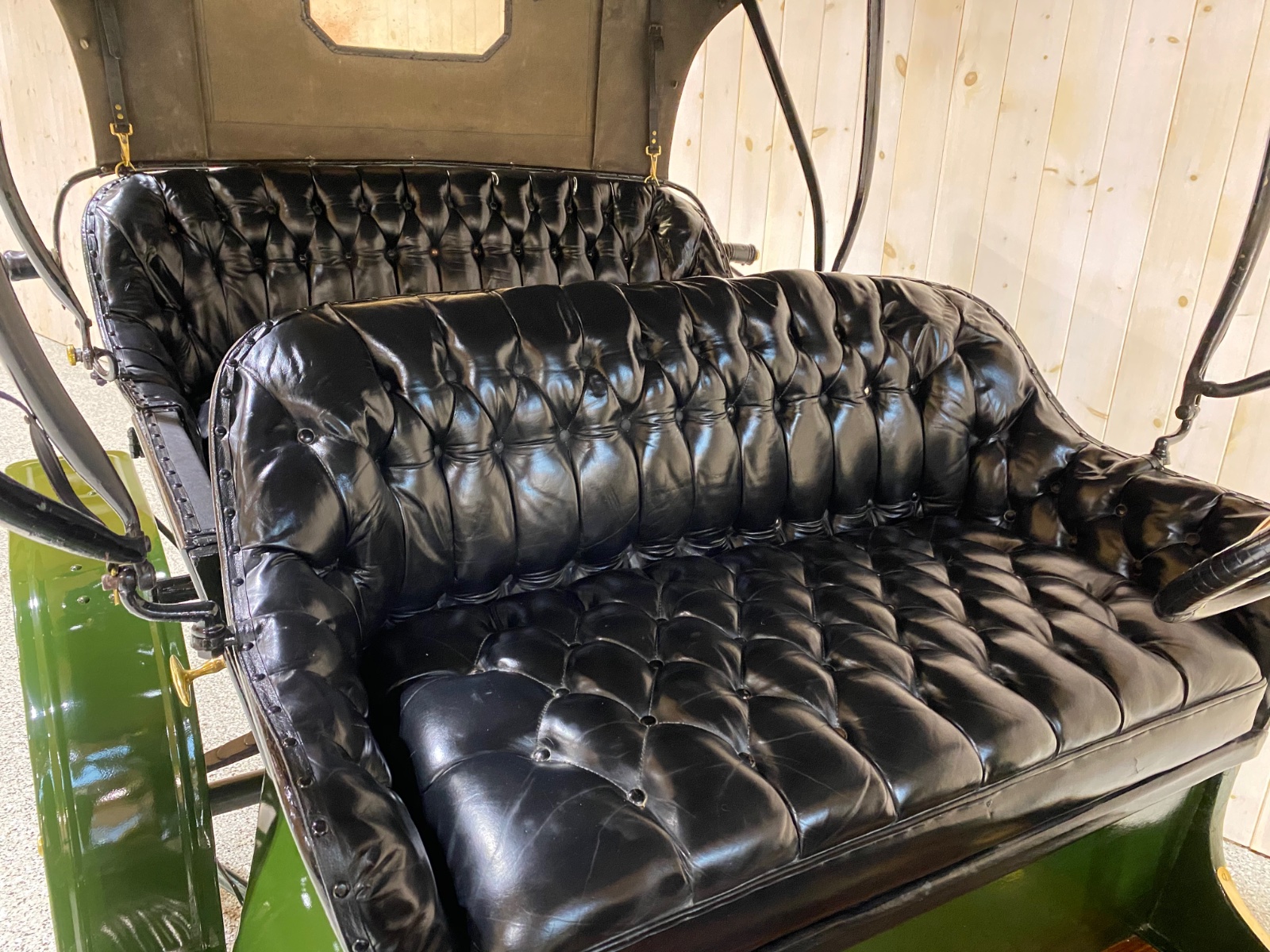 The wheels were rebuilt by Stuzman and include custom hubs that externally look identical to those shown in the Encyclopedia but internally use the tapered axles. Similarly the rear axle looks correct for the year but internally has Hyatt bearings at each end of the axle shaft. The wheels are currently equipped with white tires and the car has a spare set of new tires included. The steering column is 50” long and is equipped with a brand new brass quadrant.