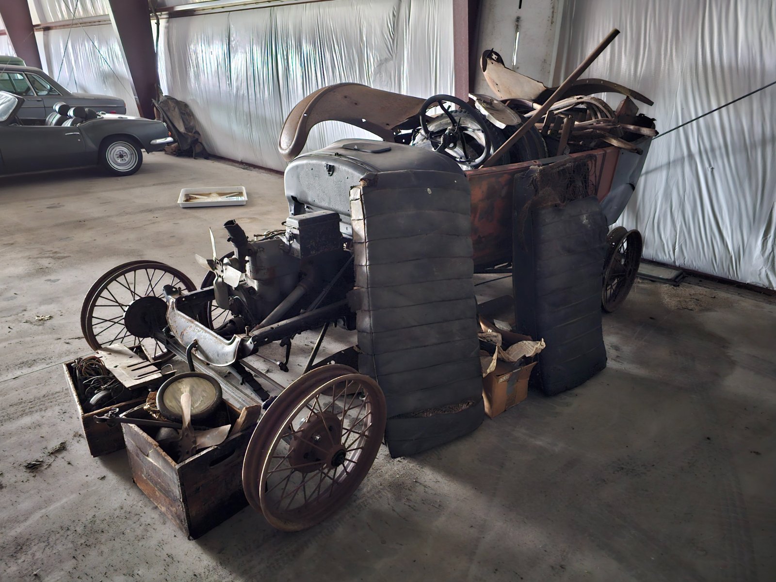 Parts car is a '27 Touring, the body isn't too great but would be good to cut down for a racer or repair. The chassis is very nice, it has a Ruckstell 2 speed rear end in it I had planned to rebuild and put in my coupe, and it seems to be about 90% complete and has 8 wire wheels. Engine stuck over the winter, but transmission seems good, and the Ruckstell seems like it will be good once it's gone through.