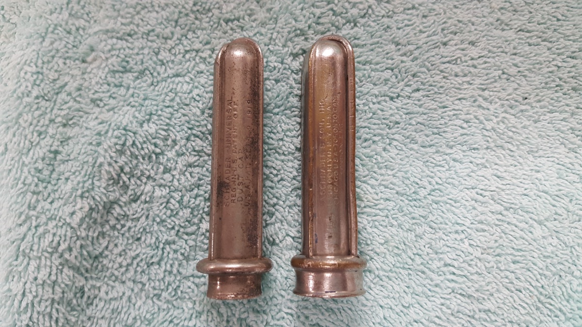 These are Schrader "Kwikonanoff" tire tube stem covers, all are nice originals, 3 sets of 4 covers in each set, plus 2 extra covers. $40 per set of 4 covers, the other 2 are both for $15, $10 domestic postage for however many you buy for yourself or friends, that is unless you purchase them all and the price for all will be $125 with FREE shipping.