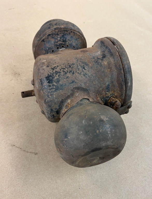 This poor old tail lamp has lived a rough life but has a lot of character. Would look great on an unrestored car or would make a nice wall hangar. Obviously, it’s missing the red lens. The bezel opens and closes and the font is dented on the bottom and has a few pin holes in it.