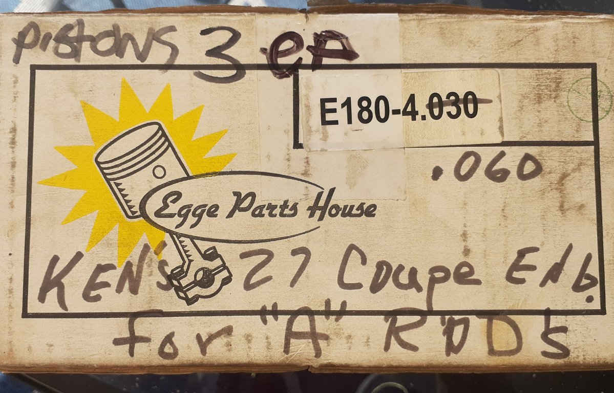 Partial set of Egge A crank conversion aluminum pistons (.060 oversize). These are no longer available from Egge. If you have the missing mate or need a few spares for your A crank engine, here they are! Price for the set of three is $50.00 plus $21.50 domestic shipping. Mark Chaffin (951) 805-0928