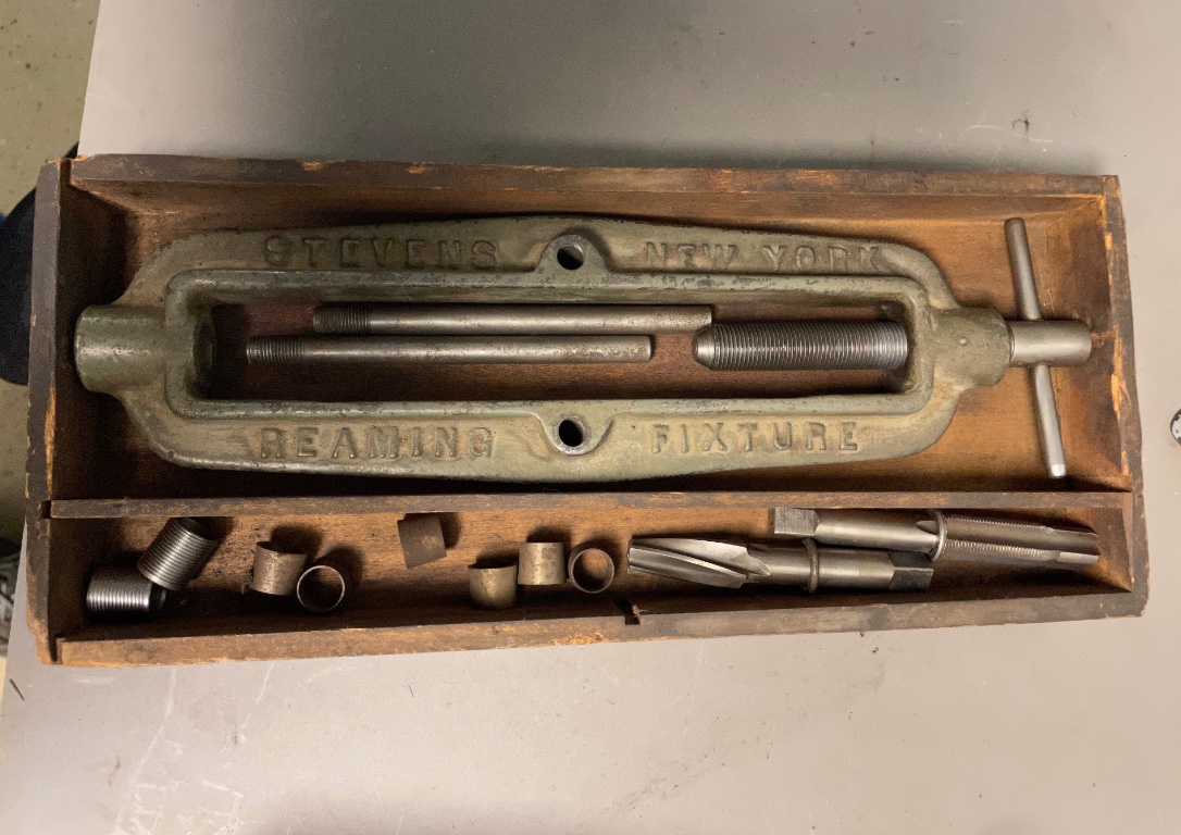 This is a complete Stevens Front Axle Repair tool for the Model T. This set of tools is used to replace worn out tops and bottoms of the front axle yokes that result from driving the car when the spindle bolts are loose. A worn hole on the top is replaced with a conical bushing, and stripped threads at the bottom of the yoke are placed with a threaded insert. This set is complete and includes the Stevens frame, the top and bottom reamers, the two alignment rods, and enough of the top and bottom bushing to repair both sides of a Model T front axle. This set of tools is in very good condition. The original Stevens reamers are in good condition. The original paint on the frame is still intact. The original wood box is included, but the lid has disappeared. $675 shipped within the continental United States.