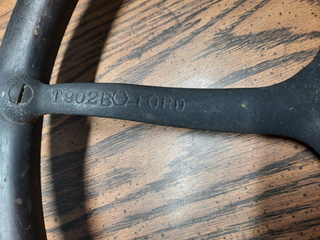 For sale: One piece steering wheel. Ford script and #T902 BO. needs refinshed and the joint needs reglued. $75 plus postage