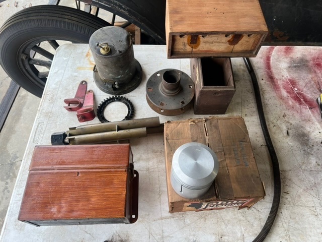 Original Brass horn tube, 40” long, $85.00.E and J brass generator top tank, $150.00. Brass exhaust whistle, $)”60.00. Jones Speedo gear, 8 pitch, 35 T, $50.00. 1909 reproduction brake rod supports, $40.00. 1911-16 front hub, $50.00. 2 Heinze wood coil boxes, no hardware or lids, $40.00 each. Set of .020 Jahns pistons$125.00. Metal coil box with 4 coils, $100.00. KdmksAT att.net. All plus shipping.