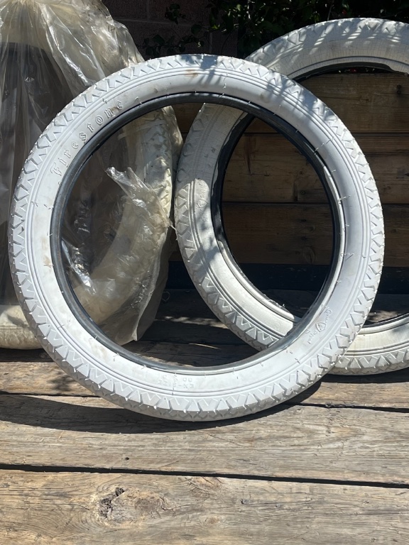 These is a set of white firestones, 2. 30x3 and 2 30x3.5. These are new unused tires, but are around 25 years old. I mounted 1 and it had cracks so I took it back off. Should be quite usable but that’s up to the buyer. $800 for the set of 4. Plus shipping. Kdmks AT at.net.
