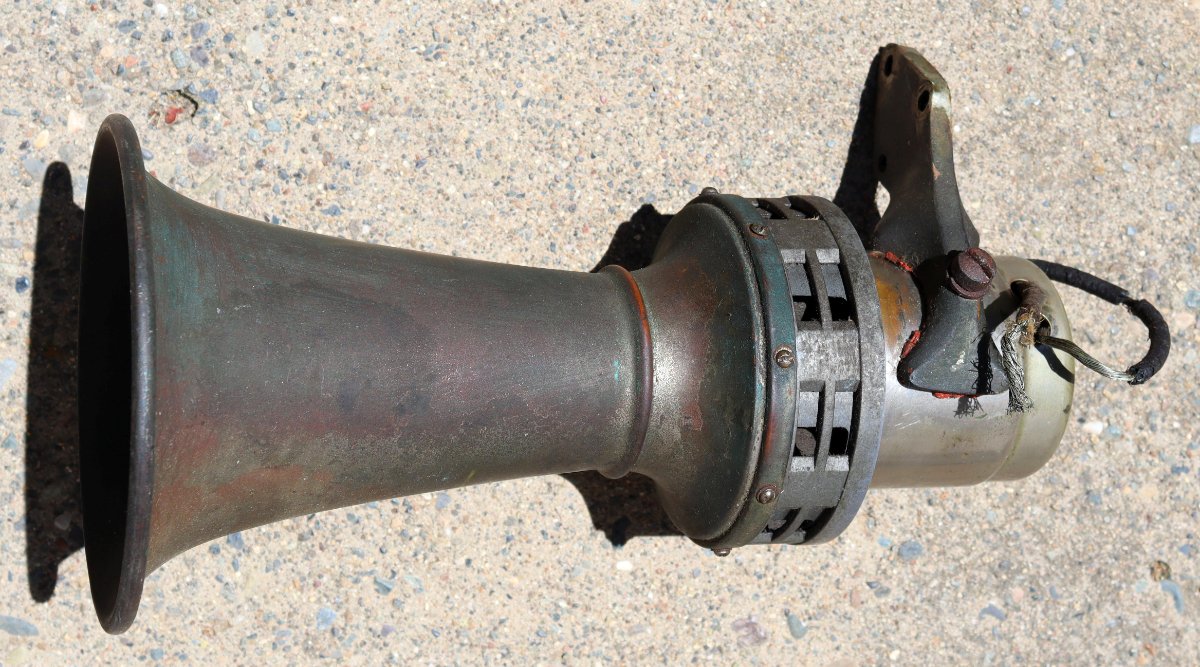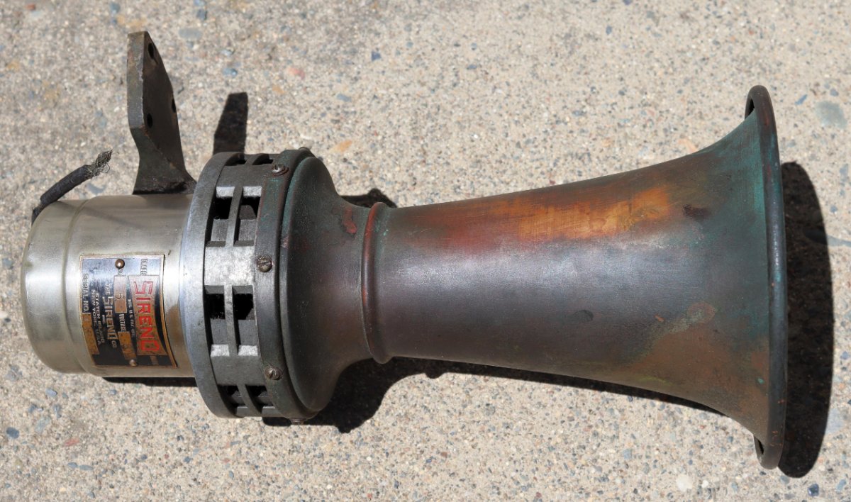 This siren really puts out some noise! It measures 12 inches long and the bell is 5 3/4 inches in diameter. This was working when I got it back in 1999 and I never got around to restoring it. The wire leads have since lost there insulation and will need to be replaced. I believe it was nickel platen when new. Asking $155 plus postage.