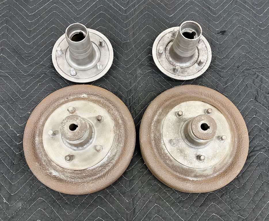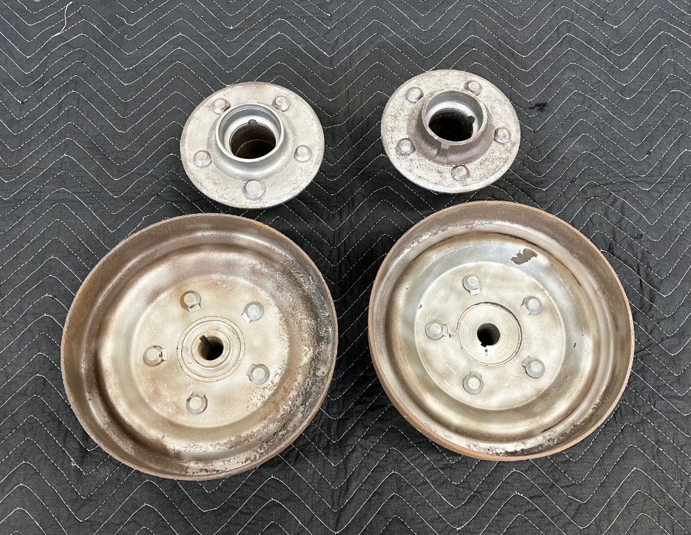 Here is a set of 4 wire wheel hubs. Just out of the blast cabinet. The front hubs have a couple issues (like most original hubs). Both have a spot that’s either a crack or a casting flaw. Kinda hard to tell. Tried to show this in the pictures. The rear hubs have nice tapers and keyways. The drums have some heavy pitting.