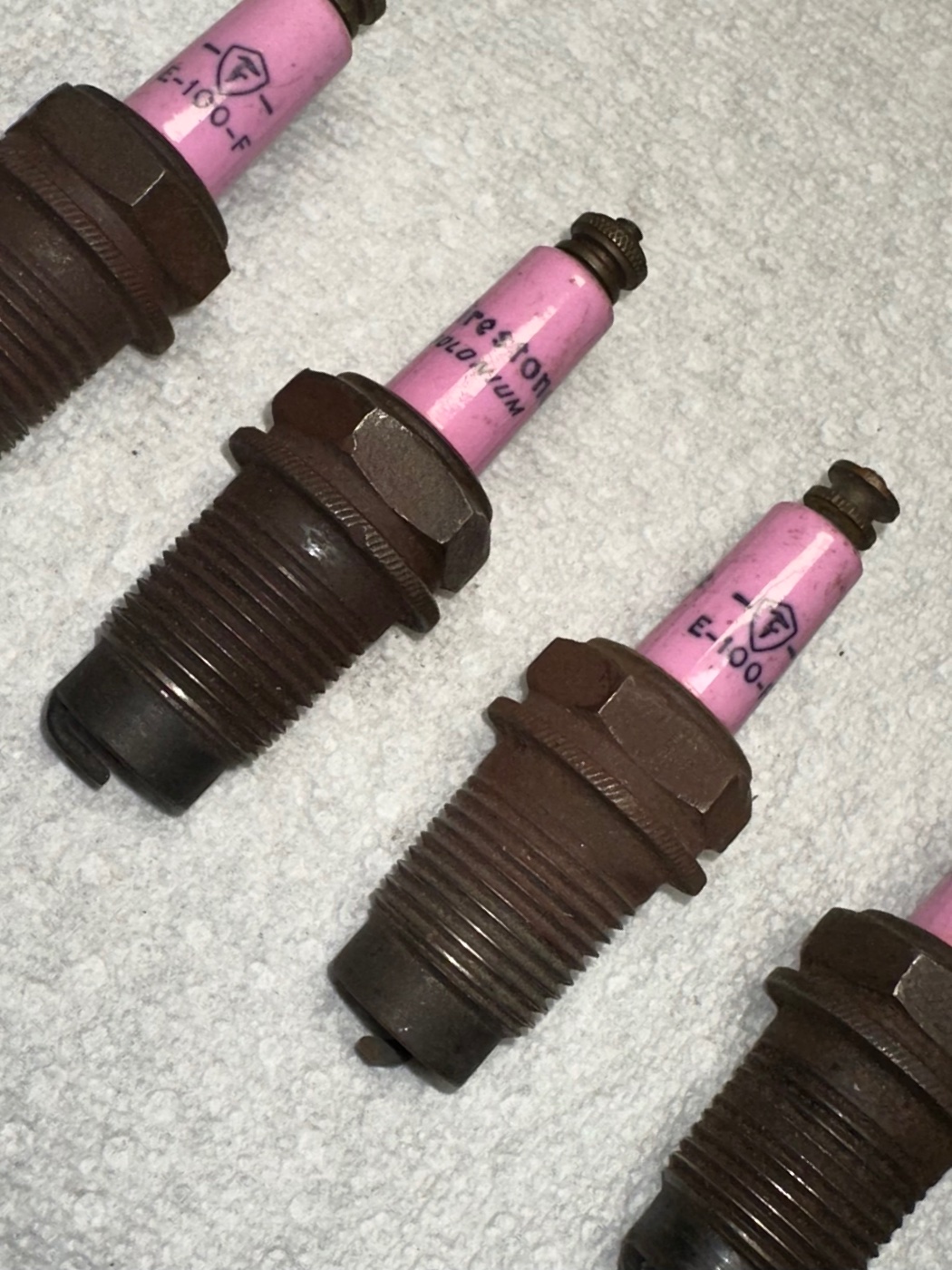 4 Champion X metal top, Ford Script, new $180. 4 Champion 31 ,Ford Script, new $160. 4 Champion X straight side w/Pat. $180 used nice. 3 Kingston appear new $100 . 4 Firestone E100 used $80. All plus postage Larry Debaugh 4103361728