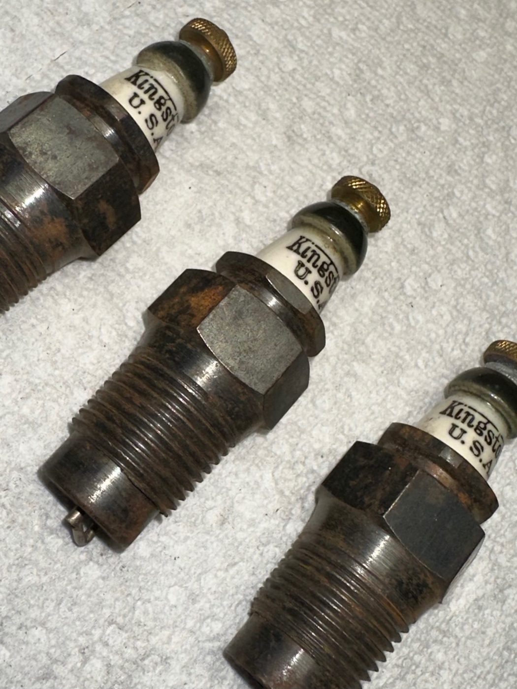 4 Champion X metal top, Ford Script, new $180. 4 Champion 31 ,Ford Script, new $160. 4 Champion X straight side w/Pat. $180 used nice. 3 Kingston appear new $100 . 4 Firestone E100 used $80. All plus postage Larry Debaugh 4103361728