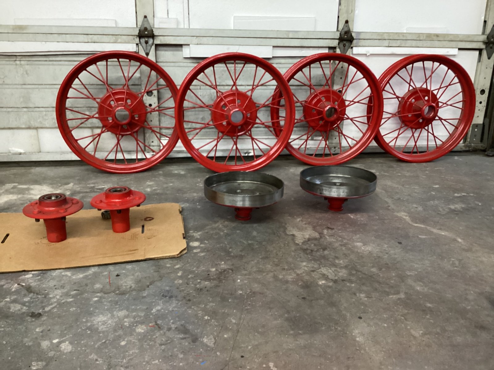 For Sale, Four wire wheels with hubs, front hubs have NEW inner/outer race (installed), NEW inner and threaded outer bearings, NEW seals, NEW cad lug nuts and 4 brand NEW universal black-wall tires with tubes. Tires and tubes still in wrapper-- Bearings have been greased but never run--