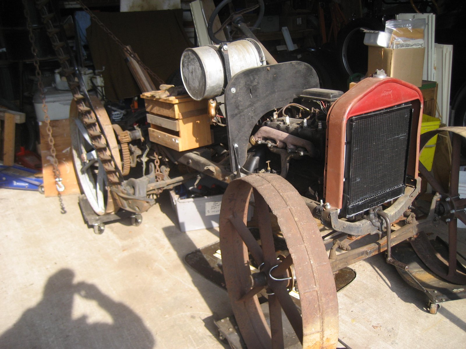 This has a 1925 engine that ran and drove about 4 years ago, mostly on and off the trailer. The drive shaft and rear axles are shortened with sprockets on the rear axles. The sprockets engage with the gears on the mower wheels. The sickle bar is ground driven and appears to work. The model of the horse drawn mower was NEW 4 by McCormick Deering 1896-1915. I had steel wheels bored out to fit Model T front hubs, it could just as easily have regular wood spoked wheels.