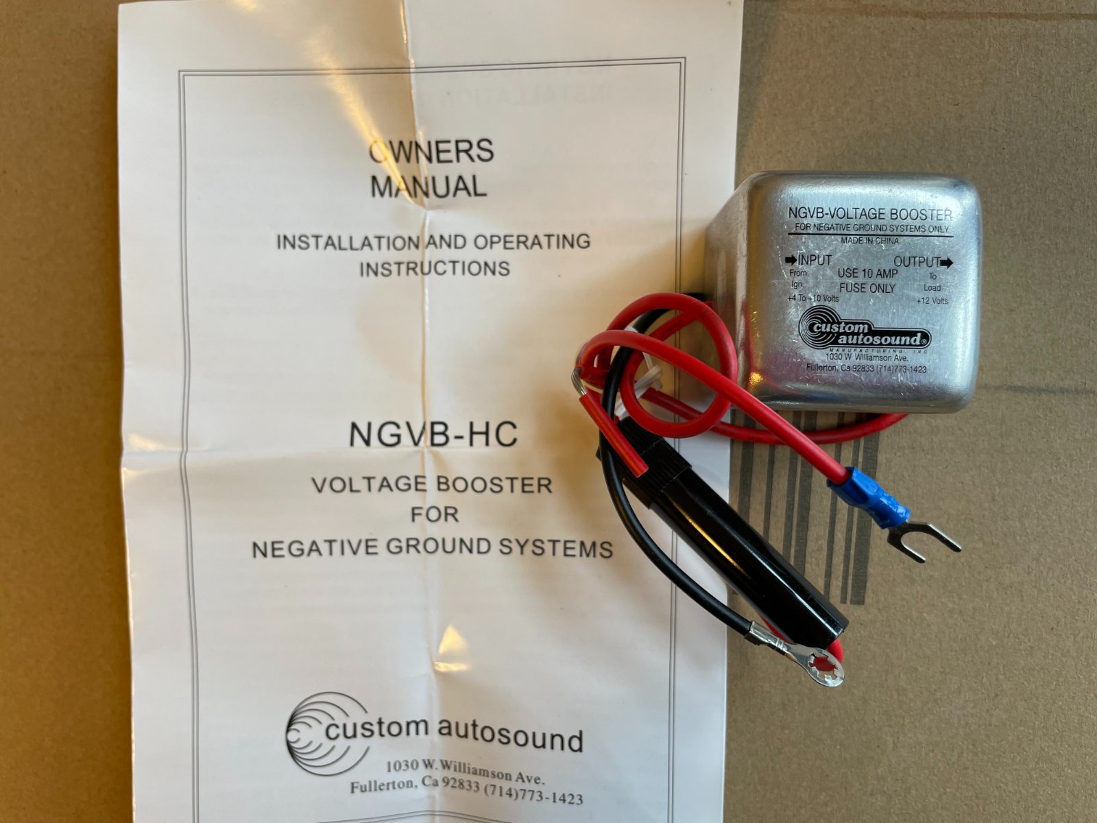 The NGVB VOLTAGE BOOSTER will operate 12 Volt negative ground accessories from 6 or 8 Volt negative ground electrical systems. Because of its very efficient design, its current draw is negligible when no load is applied. Unlike conventional boosters, which use a transformer, it can be used for memory maintenance or alarm systems in the standby mode for long periods of time without discharging the vehicle battery. Quiescent current draw is about 10 milliamps.