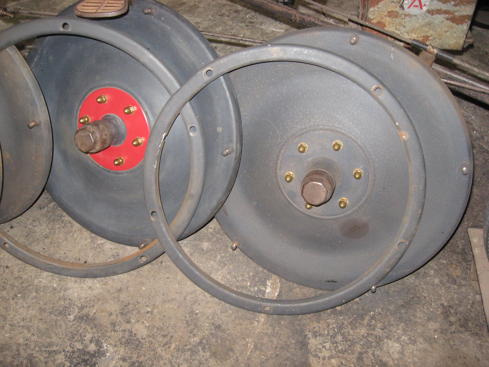 5. 4 Buffalo hubcaps (will need replated to be show quality, or buff to remove remaining plating to reveal brass) There are 3 extra beat-up hubcaps for spares. There is also a set of 4 custom brass hubcaps with the Buffalo logo. They were custom made by the previous owner because they did not have enough original hubcaps. I finally found two more original hubcaps to make a set of four useable hubcaps. There are also 4 old TT truck hubcaps to use as thread protectors till a person installs the Buffalo hubcaps. TT hubcaps are the same size.