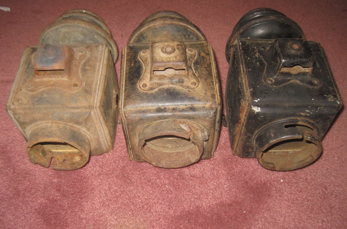 FS: 3 John Brown side lights for parts. Two right side lights with busted glass, one has a steel top, the other has a mangled fount collar. The third light fits the driver side, it's a later one without a jewel but the top is still brass, I believe. Asking $15 each or $40 for the whole pile, shipping not included.