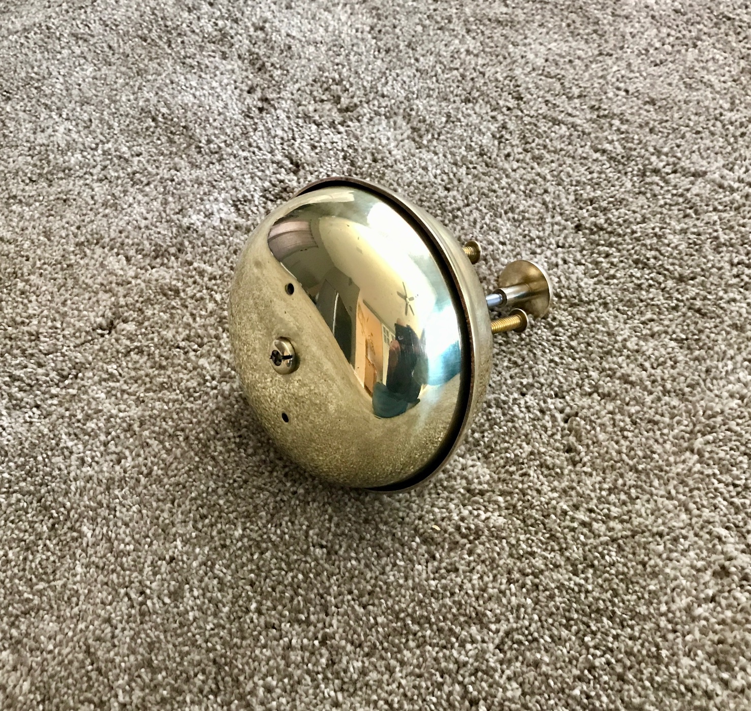 Here is an original T era Bevin polished brass Bermuda bell. Heavy thick brass. It has a nice polish, no dents or cracks, just a few tiny nicks here and there from actual road use under a T. It works great, very, very loud DING DONG! when plunger is depressed. Holds the fading tone after ringing, something only original bells can do. Very clean. Ready to mount under your floor board with 4 screws and nuts. 5.5 diameter bell. I have one on both my Ts. Great fun. A must have loud noise maker! 250 includes shipping.